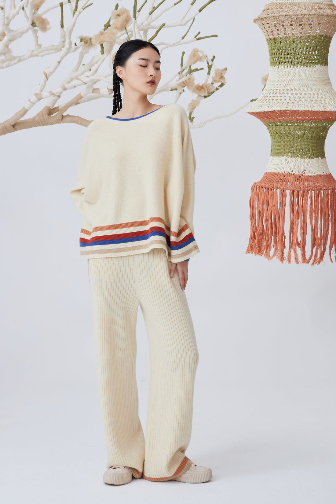 Women's wide-leg fringed fine cashmere trousers