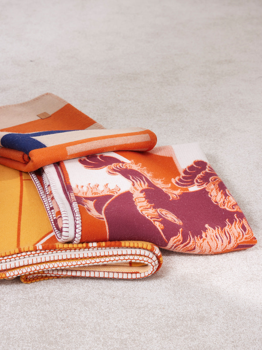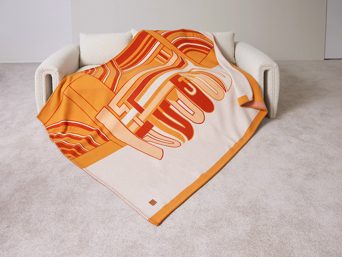 Wrap yourself in the warmth and elegance of this reversible cashmere throw. Crafted from the finest cashmere, it features a stunning jacquard pattern in vibrant shades of orange. The soft and luxurious feel of the cashmere, combined with the intricate design, makes this throw a timeless piece.