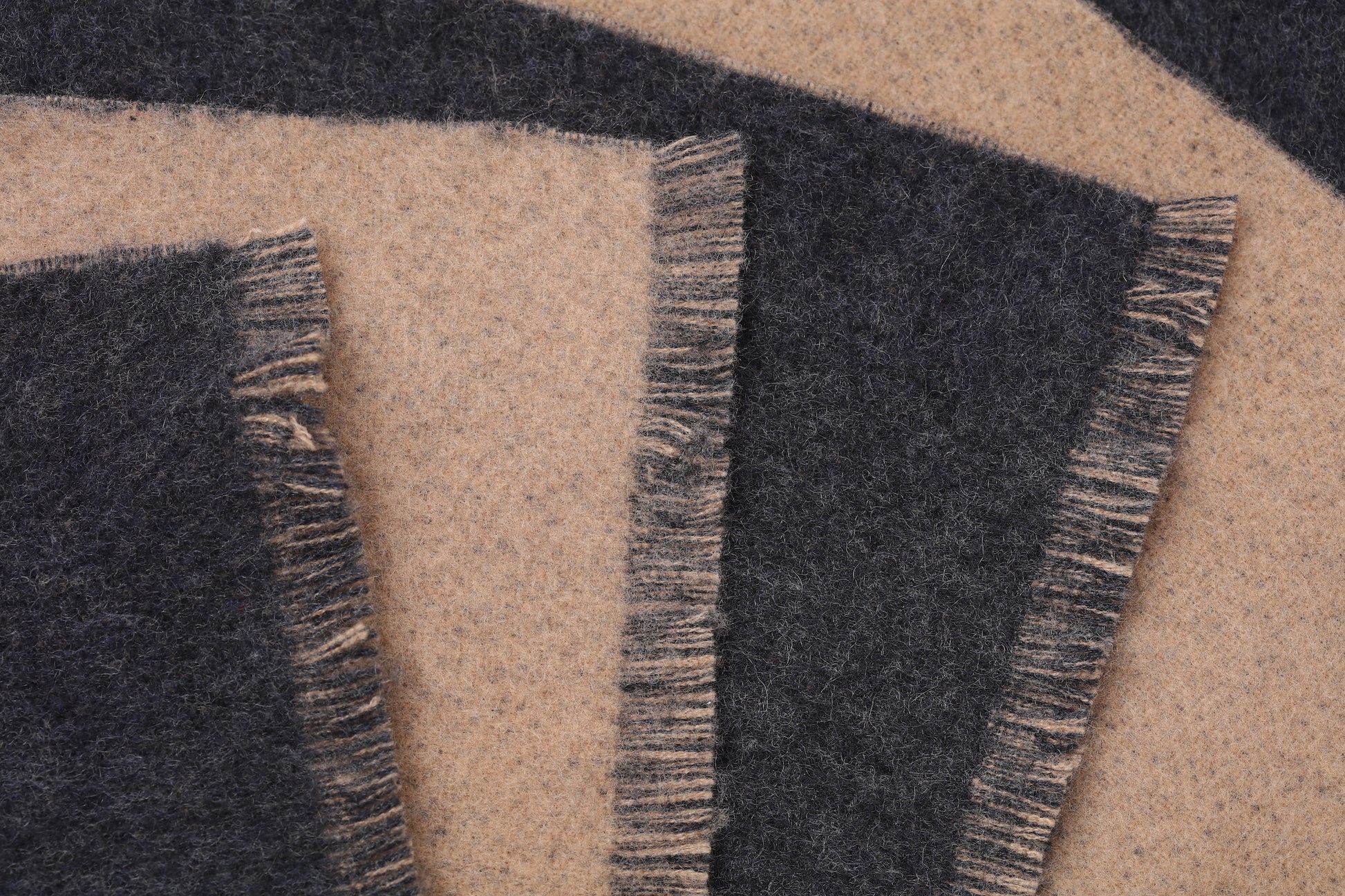 Double-sided cashmere blanket jacquard with logo, featuring fringed edge. Relatively light weight, natural and warm color, a perfect fit for domestic life and travel.