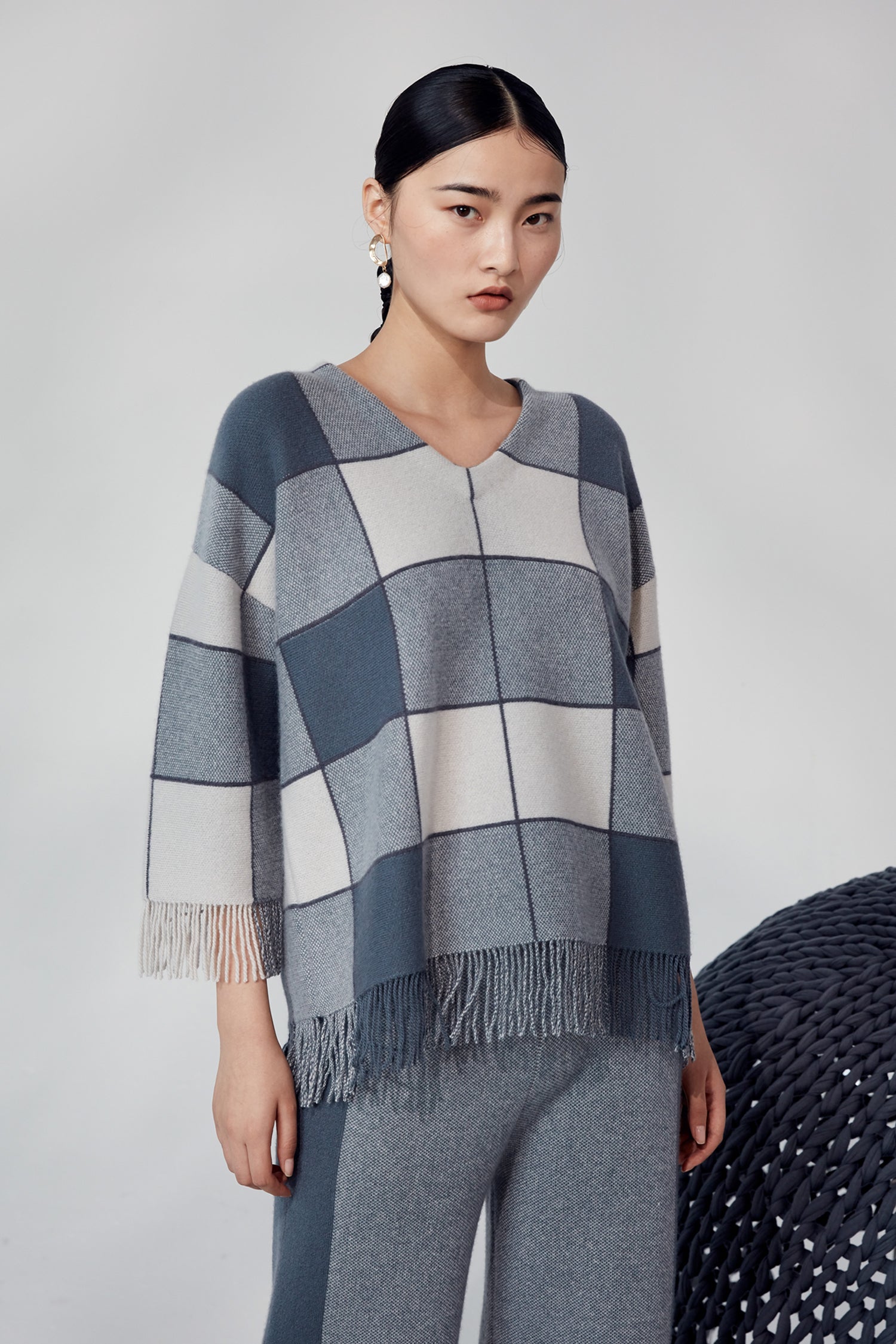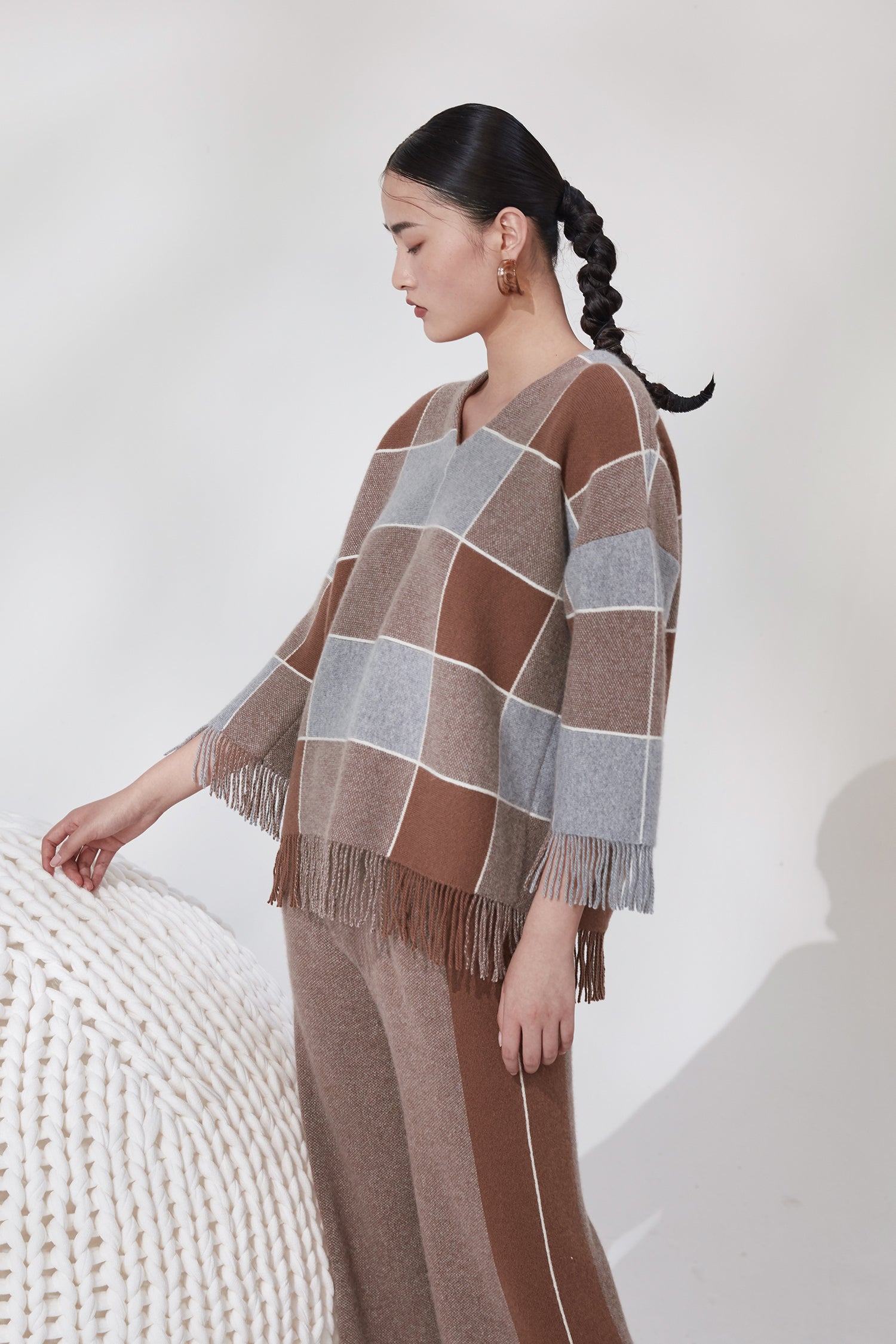 Boxy cut extra thick sweater knitted with jacquard. Styled with check pattern and a v-neckline. The tassels along the hem are hand-twisted.