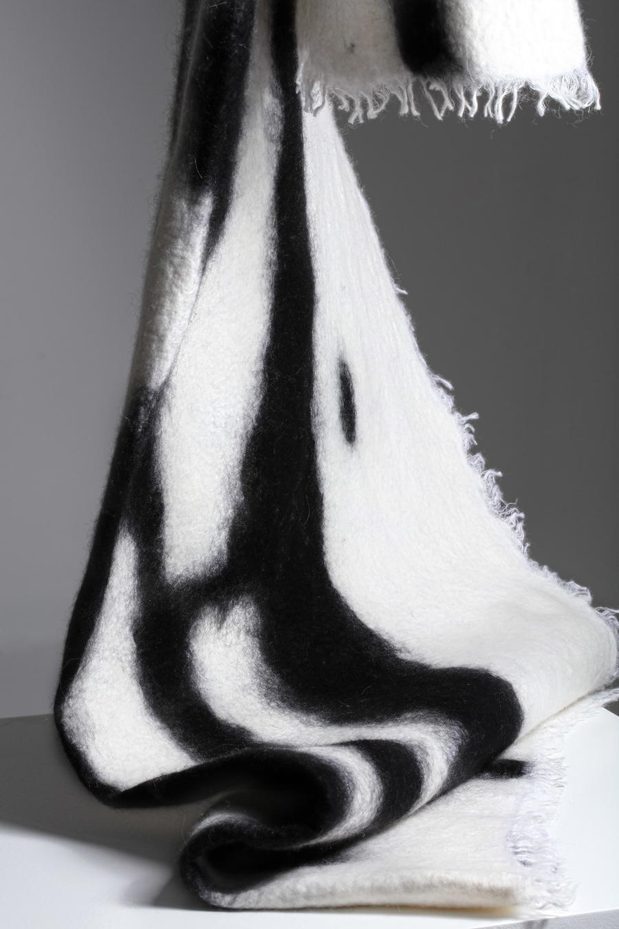 Fully hand-patted cashmere scarf using ancient Mongolian felting technique with raw cashmere material. One of a kind art piece through 12-hour elaborate process. Designed by Junko Koshino.