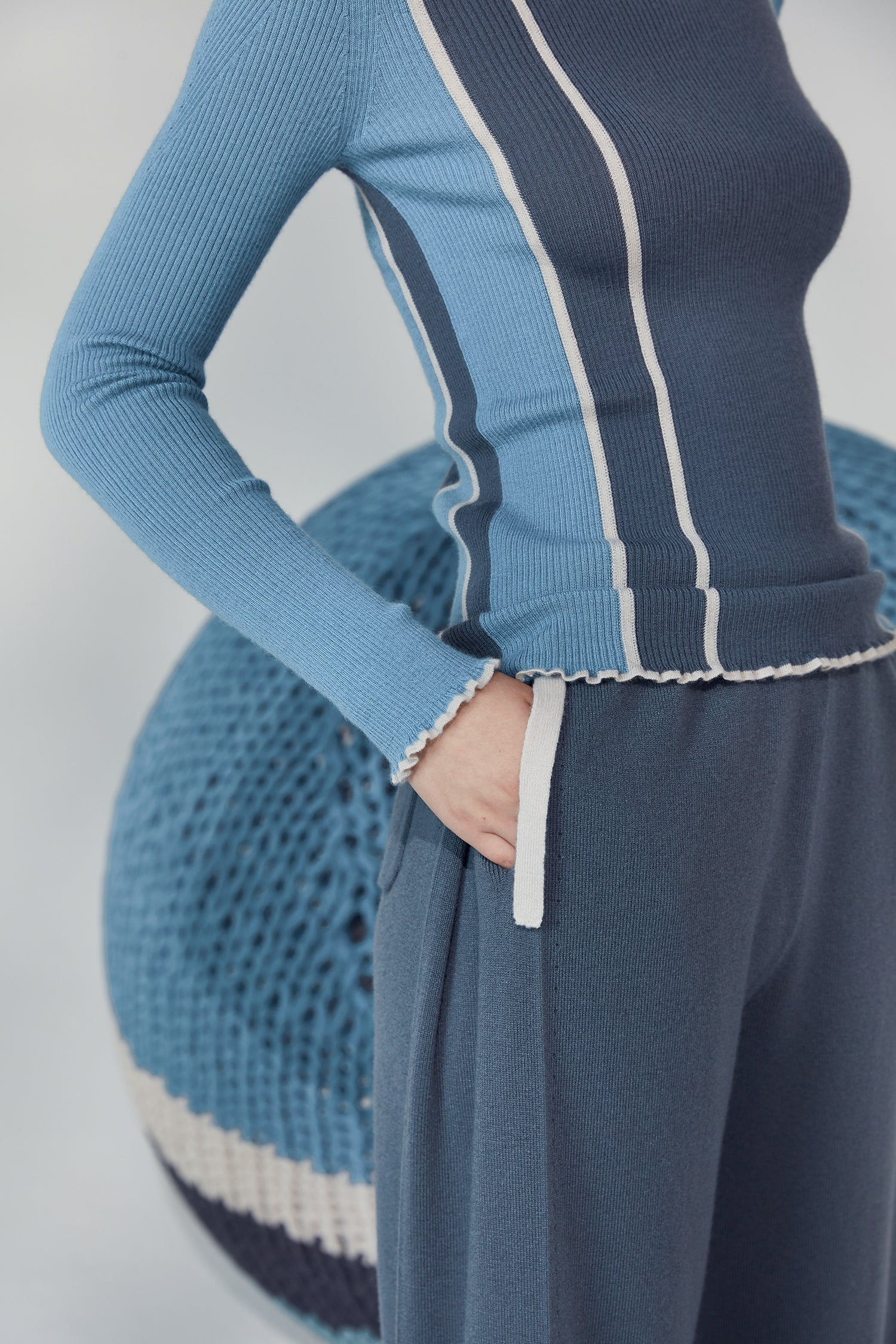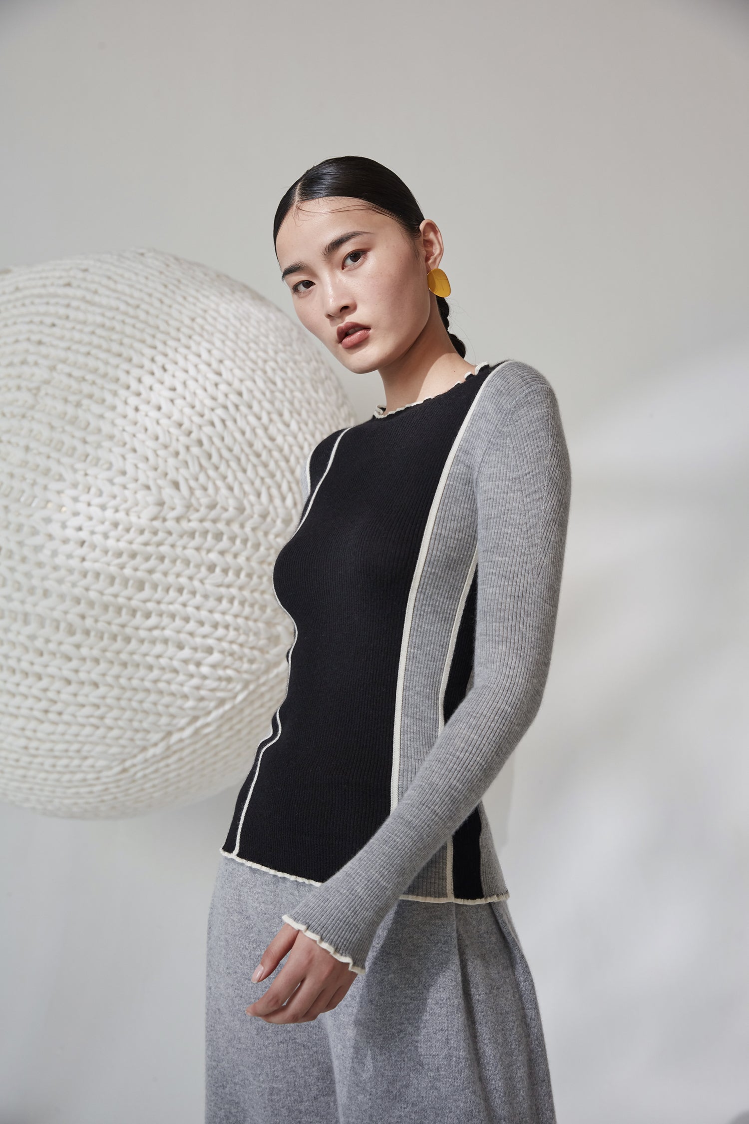 This round-neck sweater is knitted from pure cashmere worsted yarn with a fitted silhouette, features contrasting color and slightly flared details along the hem and neckline.