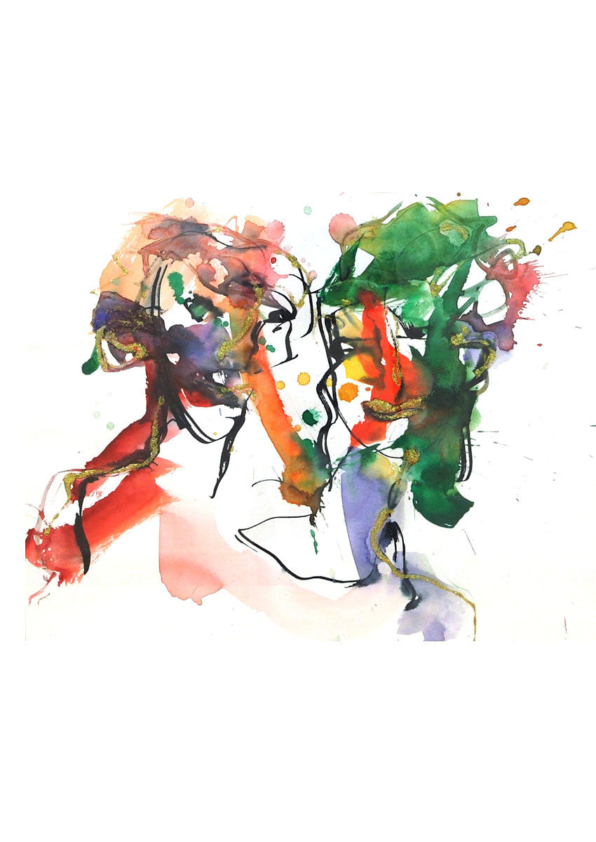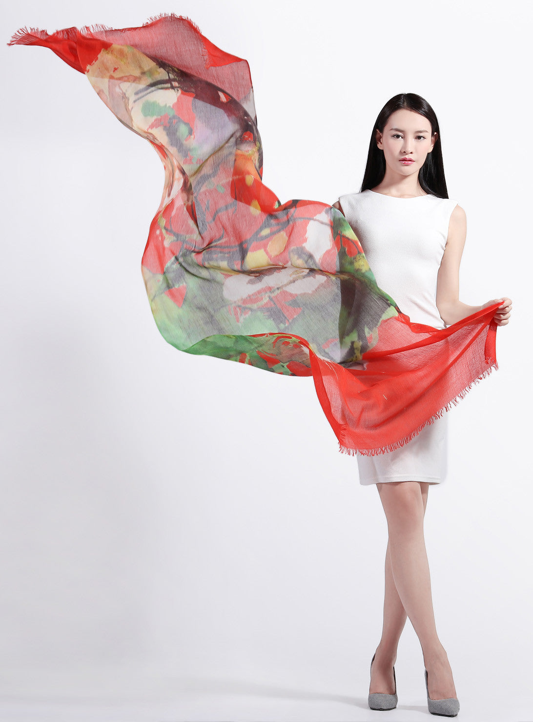 This scarf creation by French artist Francesca Brenda Mitterrand presents "Man and Woman”,an abstract painting expressing the love between the two; the artist's creativity is brought to life via digital printing technology.