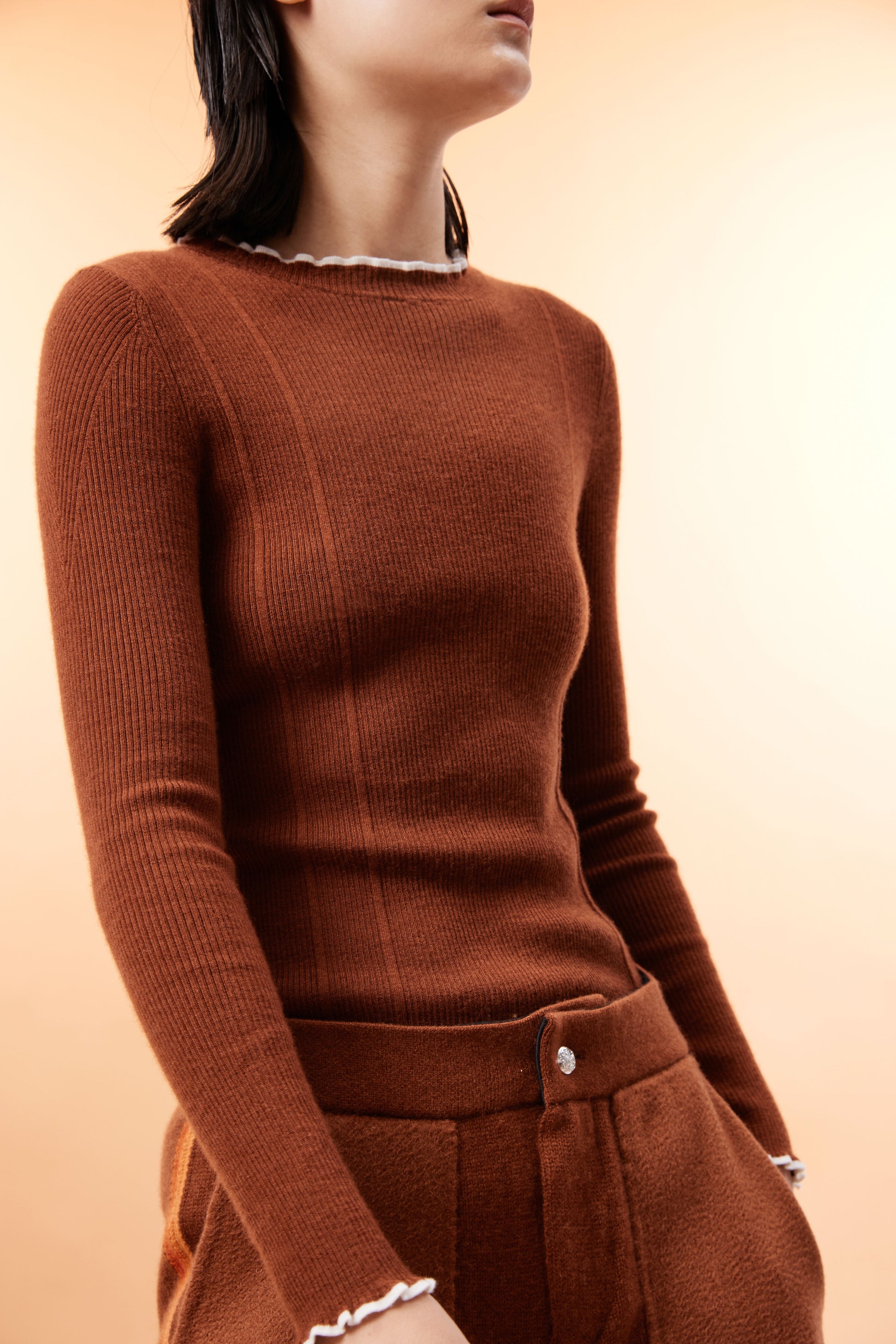 Worsted fine cashmere crew neck top featuring long sleeves, a tight fit and a curly hem.