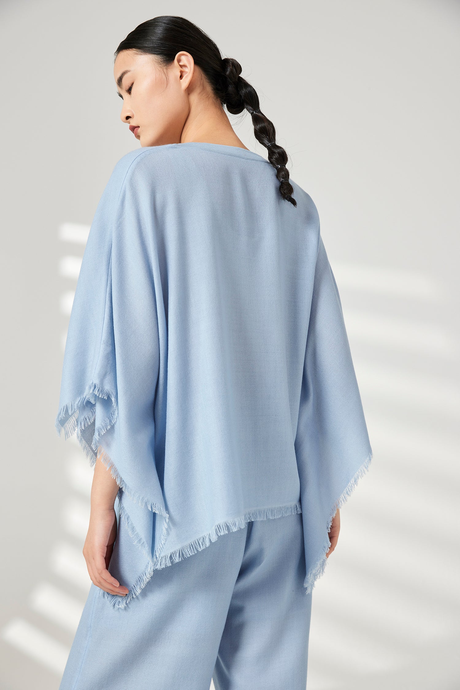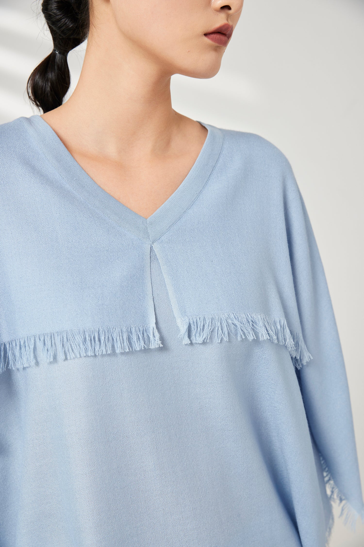 Super fine cashmere loose-fit cape-style top featuring short sleeves. Hand-made fringed edge, V-neck.