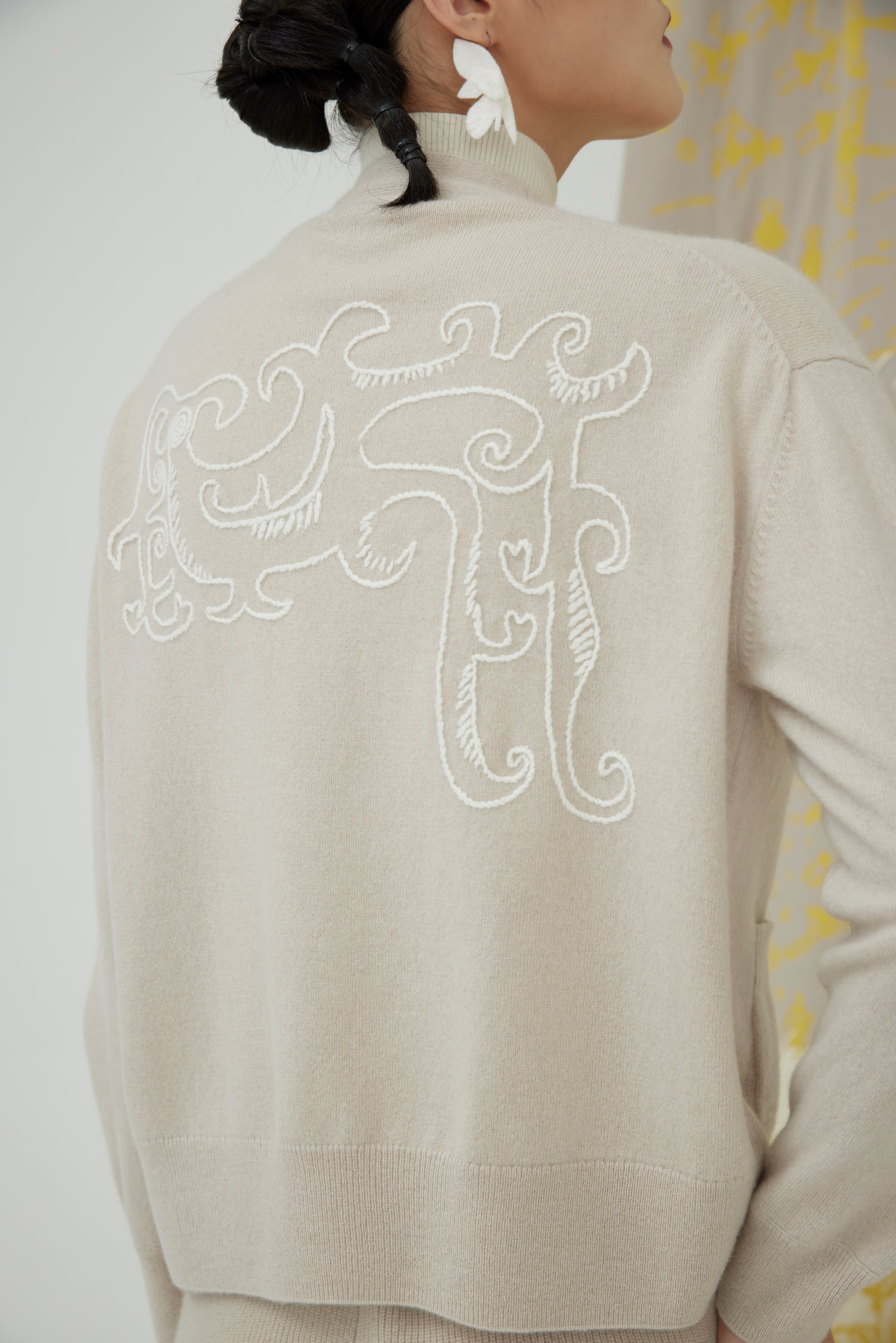 100% cashmere V-neck cardigan with handmade embroidered pattern of traditional phoenix. Part of the "Girls for Girls" women supporting project of Sandriver.