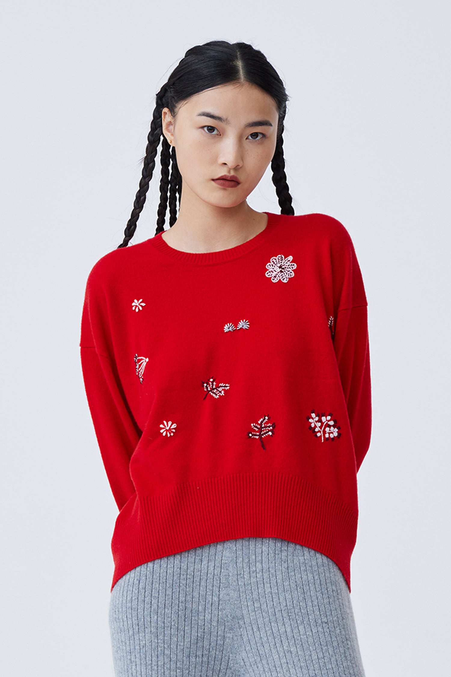 Pure ribbed-knitting cashmere top with a crew neckline and hand-embroidered pattern. Regular fit.