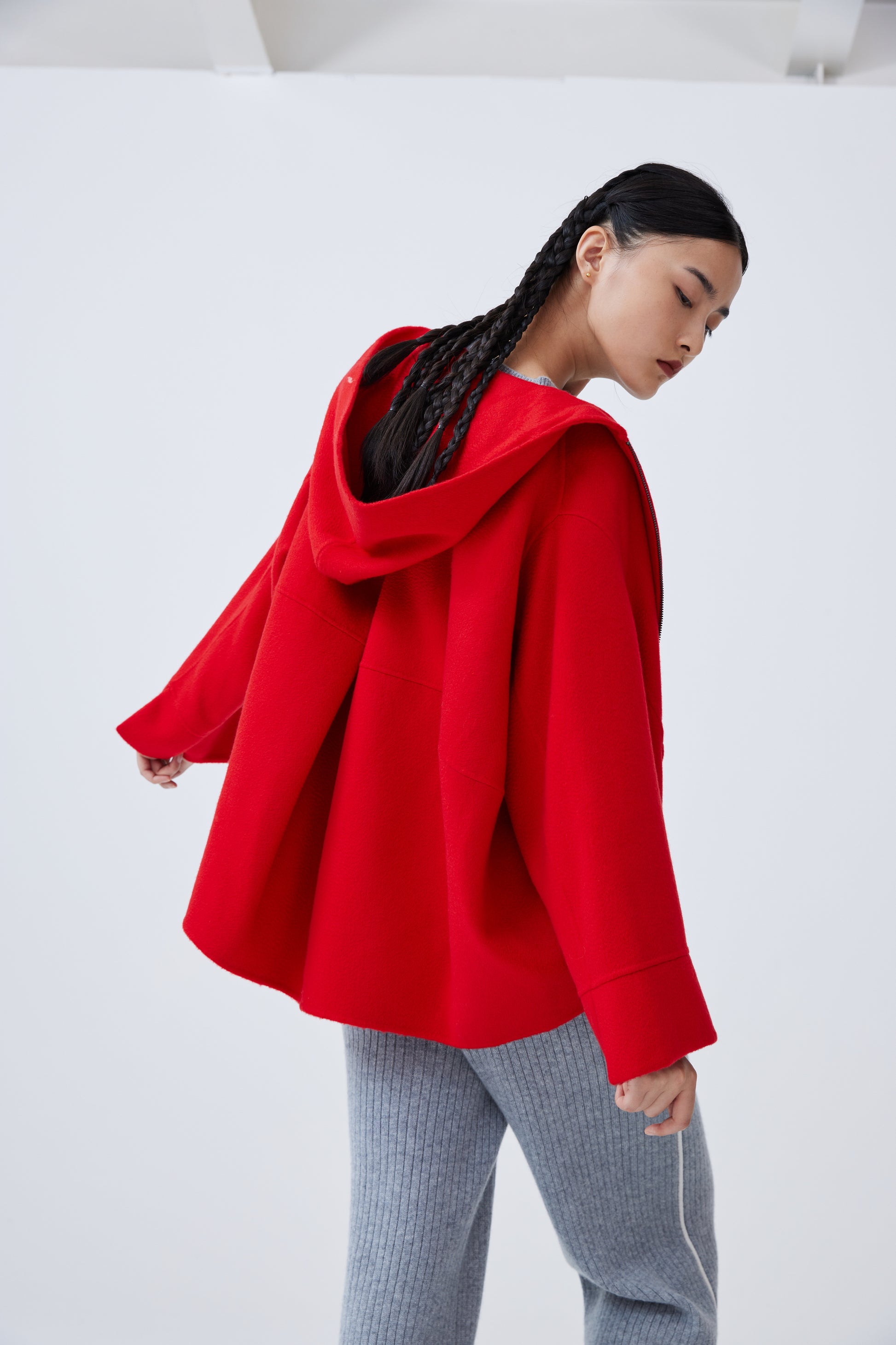 100% double-faced sable cashmere hooded zipper jacket. Oversized and-stitched, split-side sleeves.