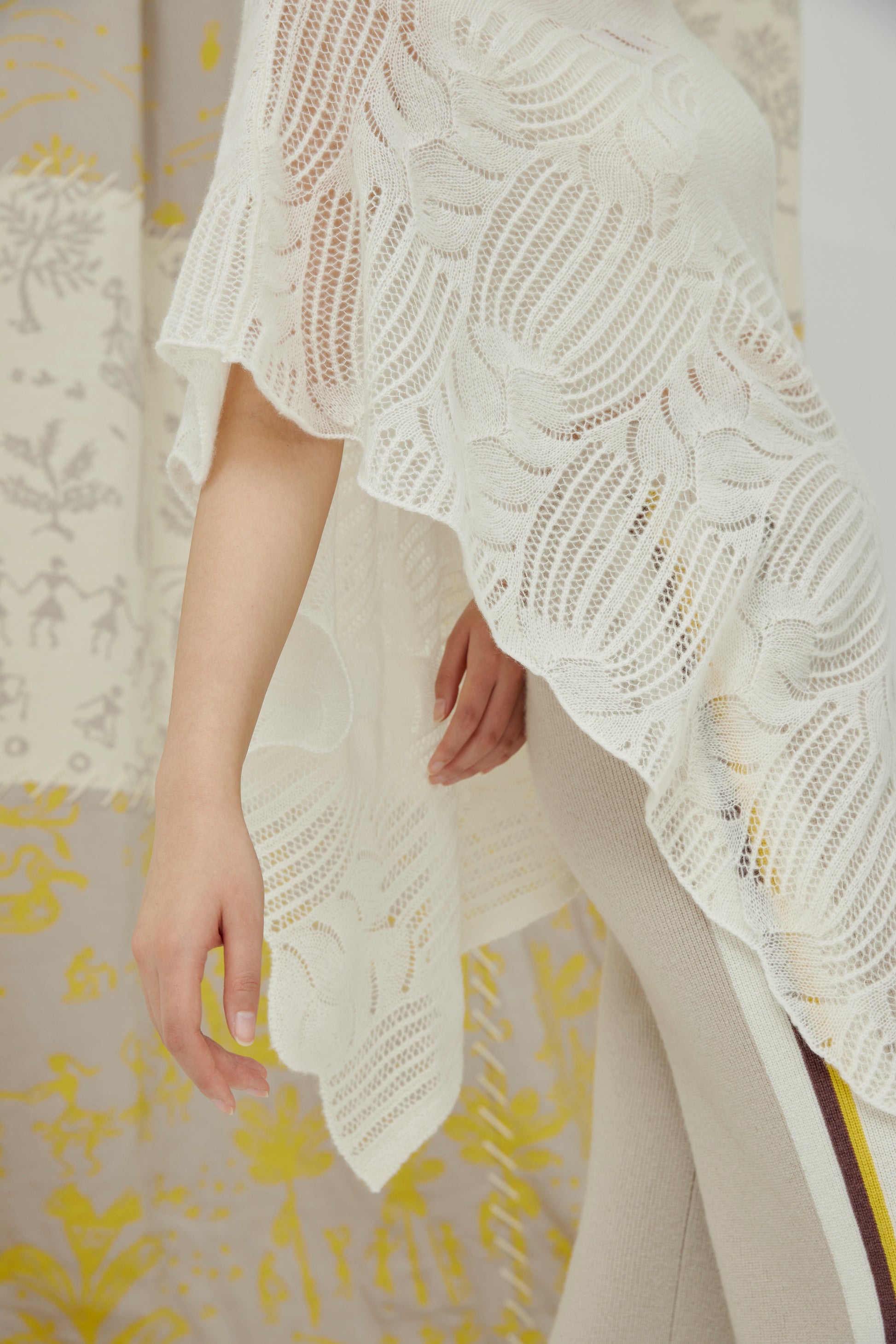 A light weight silk-cashmere cloak-type shawl, semi-sheer construction. Unique square-shape.