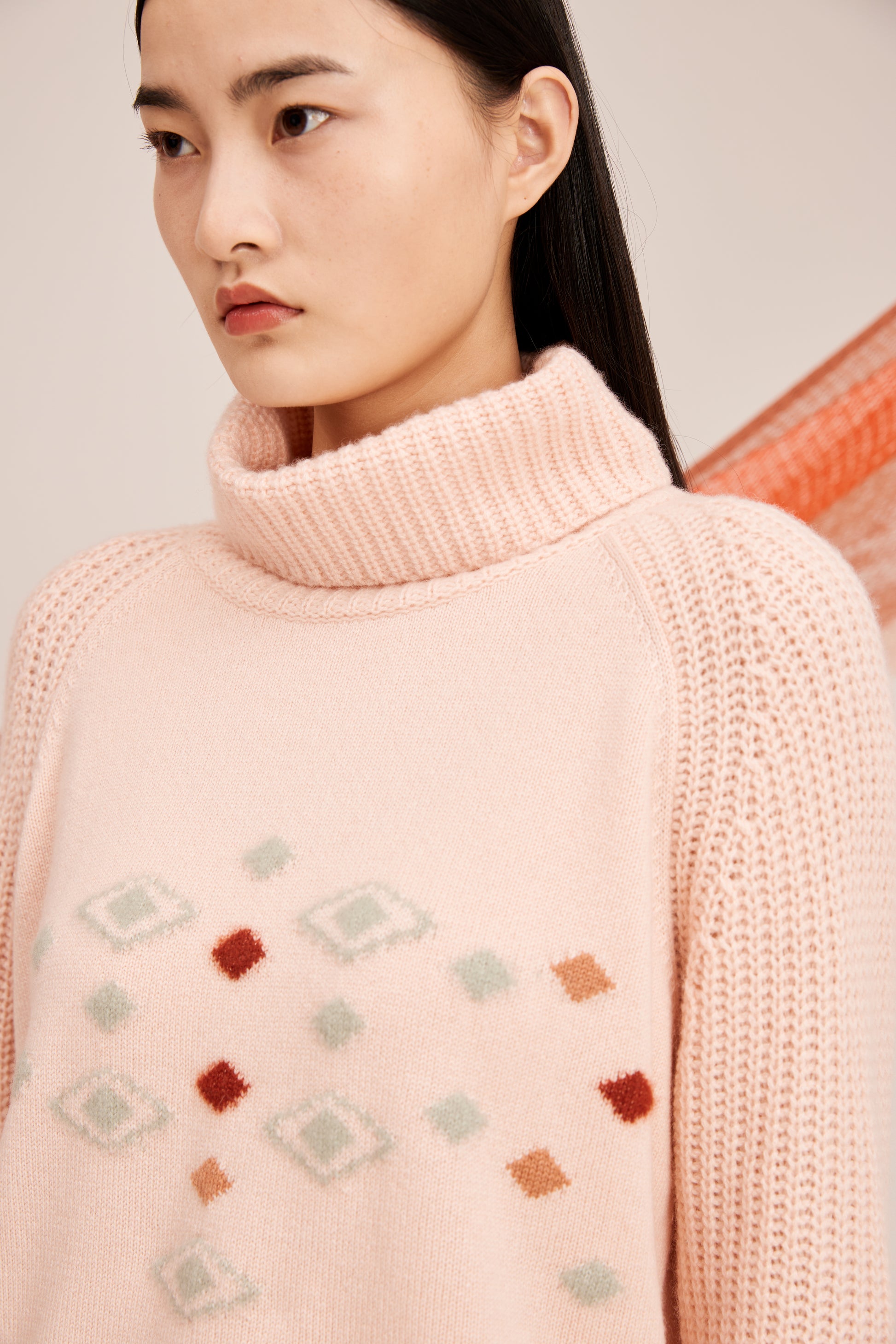 Pure cashmere bottle collar pullover, seleted 100% cashmere from Inner Mongolia, supler light and soft, the artic pattern on the chest to create sophisticated touch.