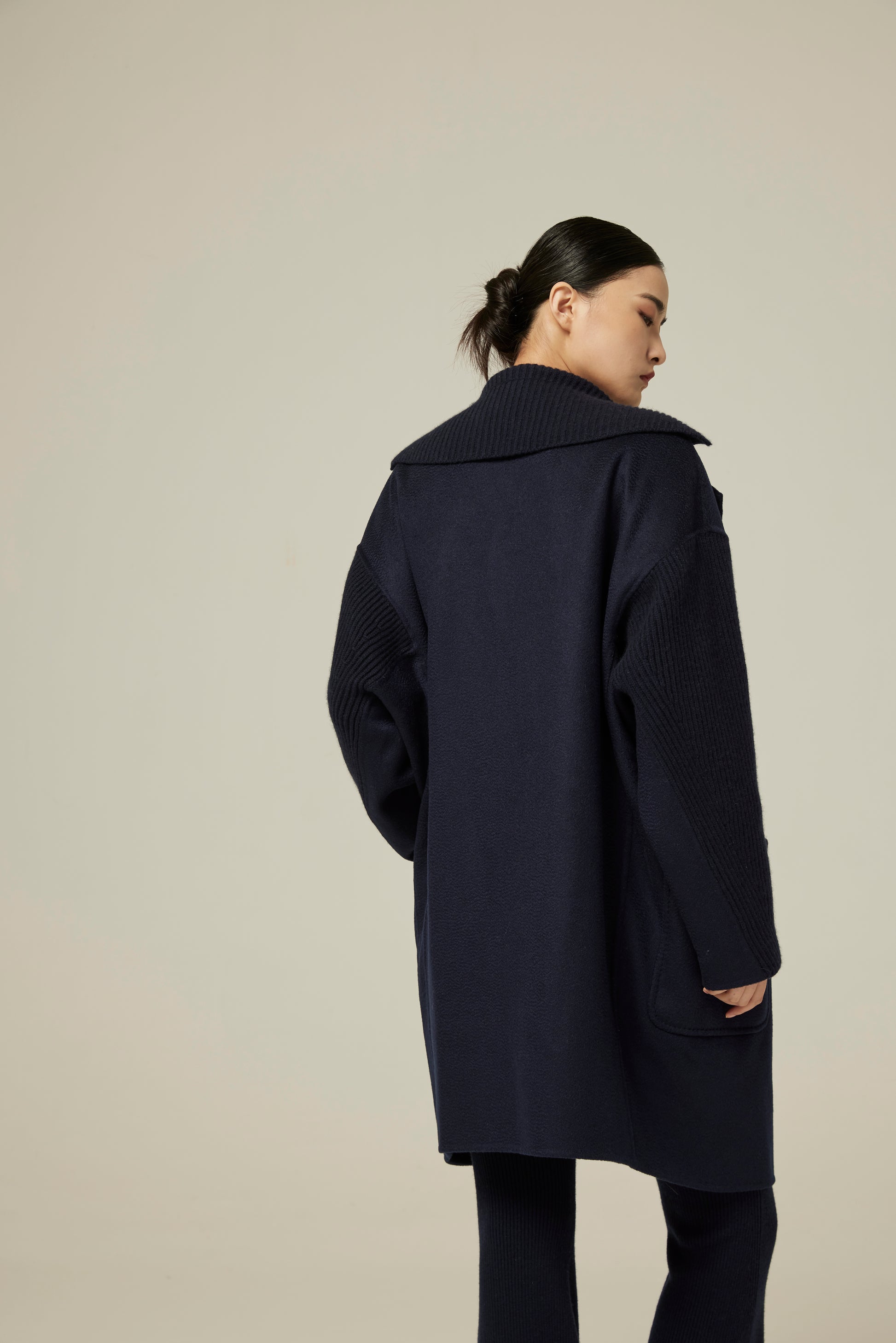 Double-faced long cashmere coat, hand-sewn straight cut, joint with knitted collar and sleeves.