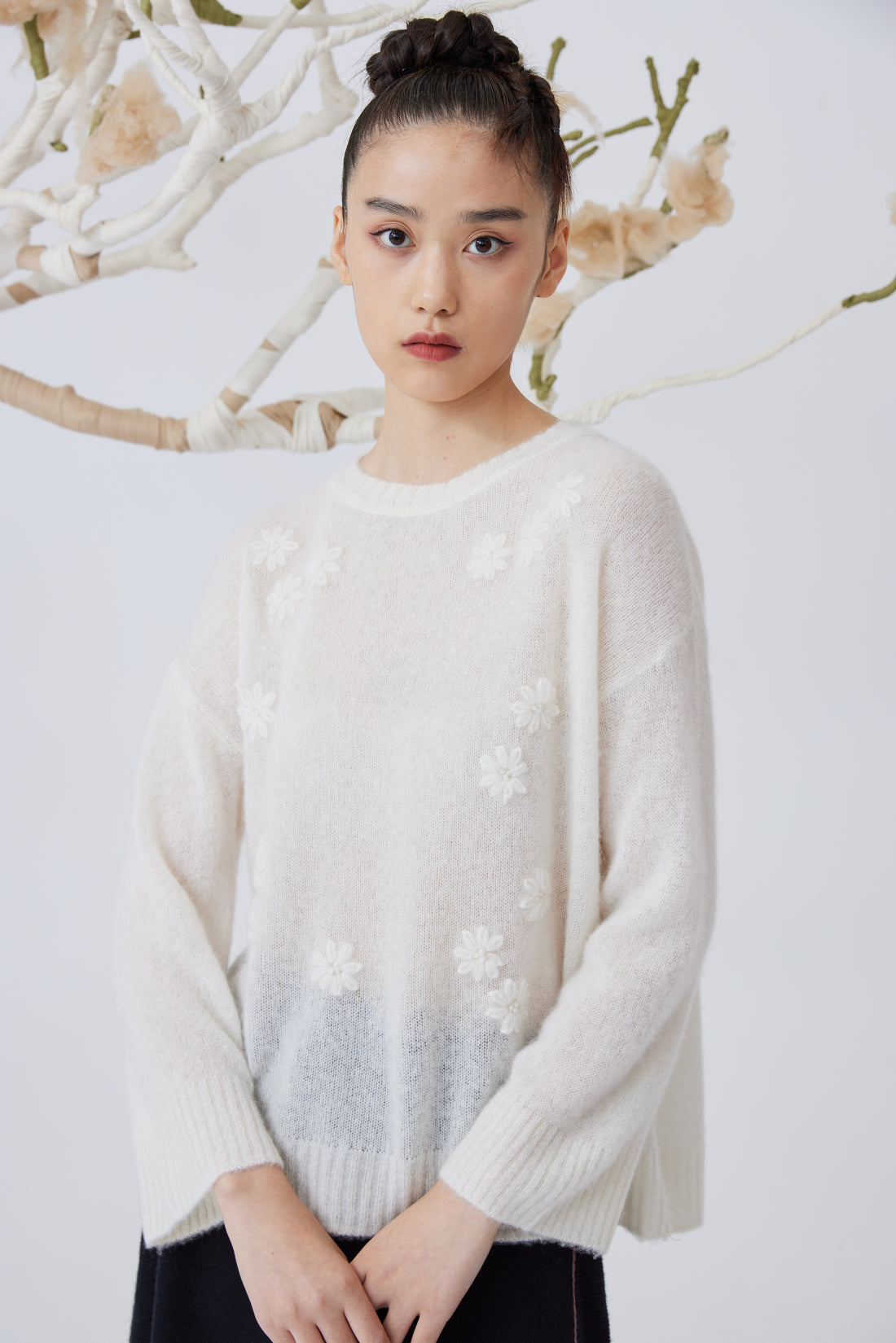 Loose density top with 75% cashmere and 25% silk fabric, handcrafted embroidered flower. Straight open...