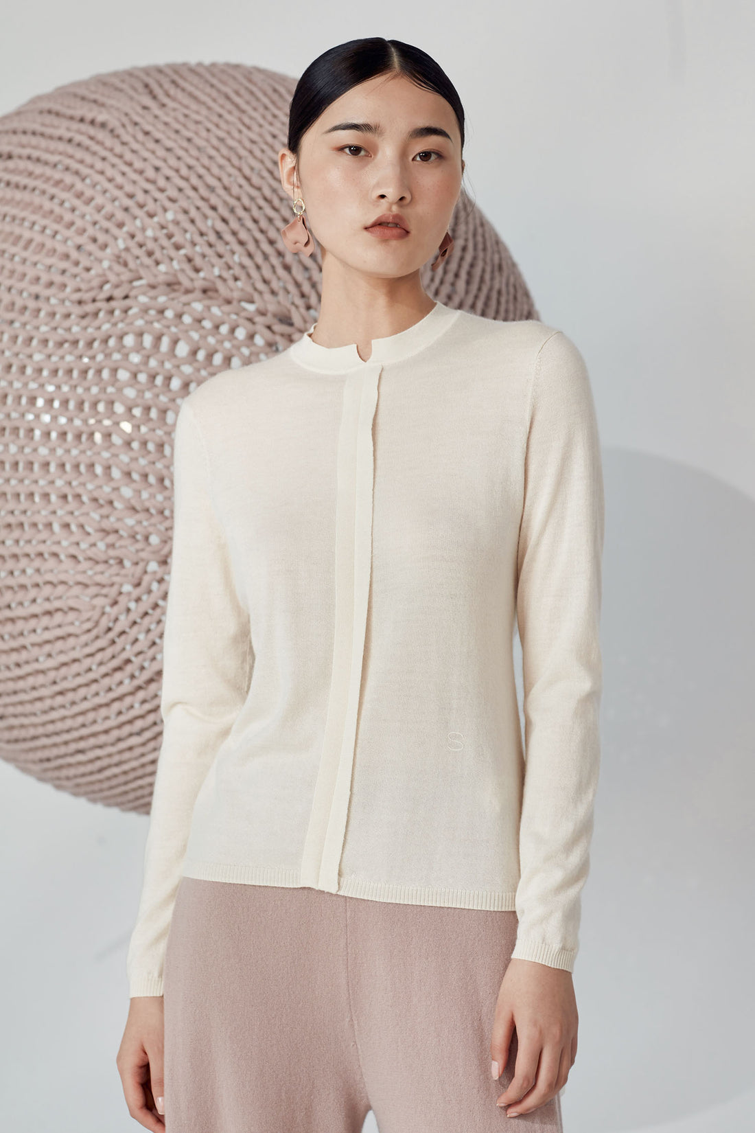 Worsted fine cashmere crew neck top featuring long sleeves, a tight fit and a curly...