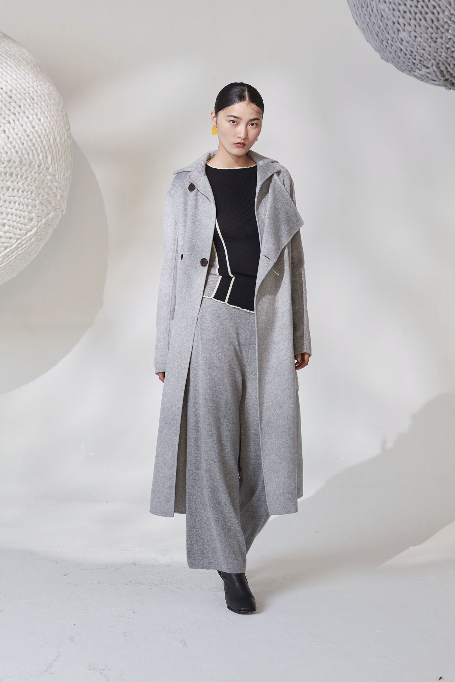 Double-breasted trench coat crafted from pure cashmere. Styled with lapels and collar with high splits at the back, it features a reversible fabric and hand sewn details.