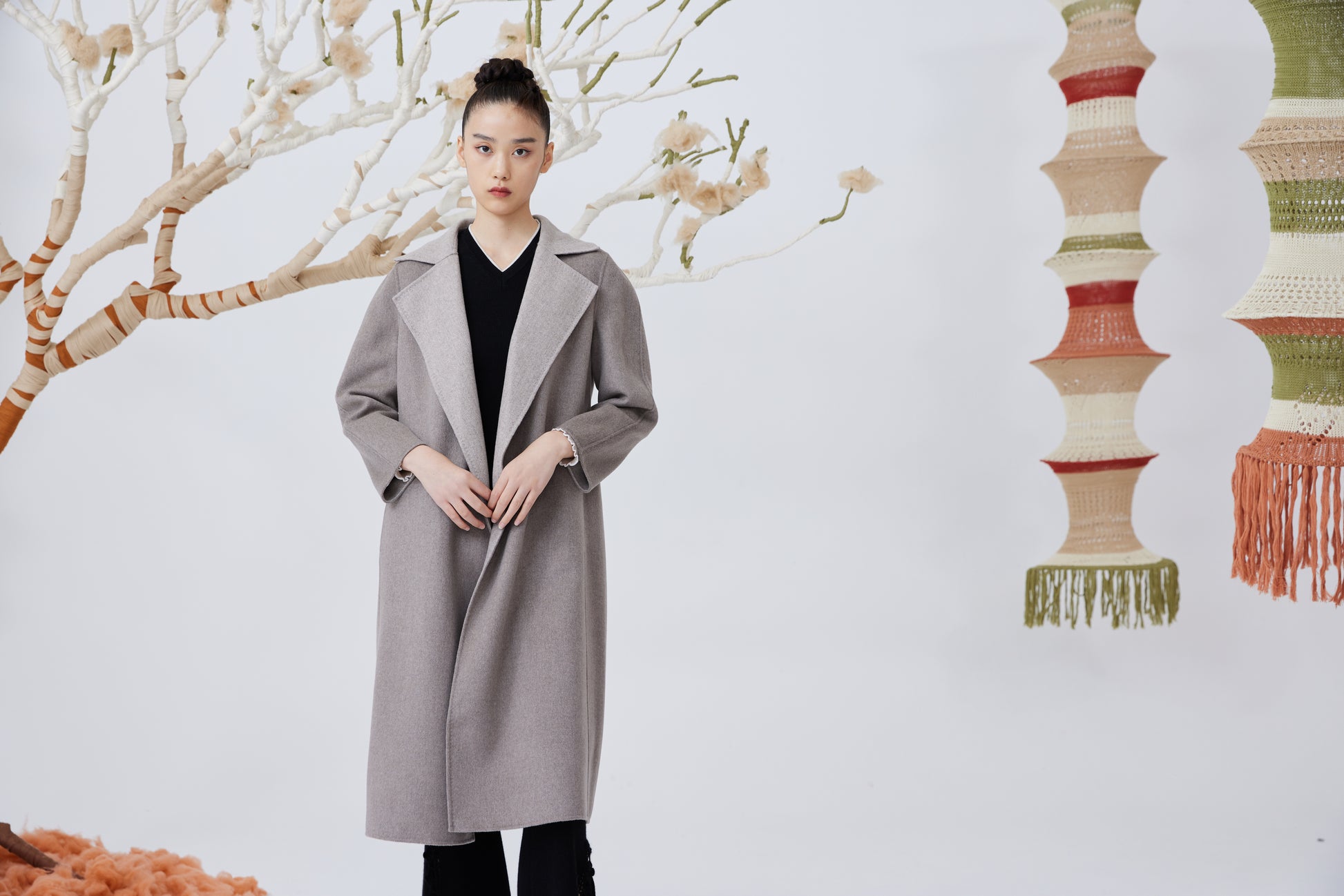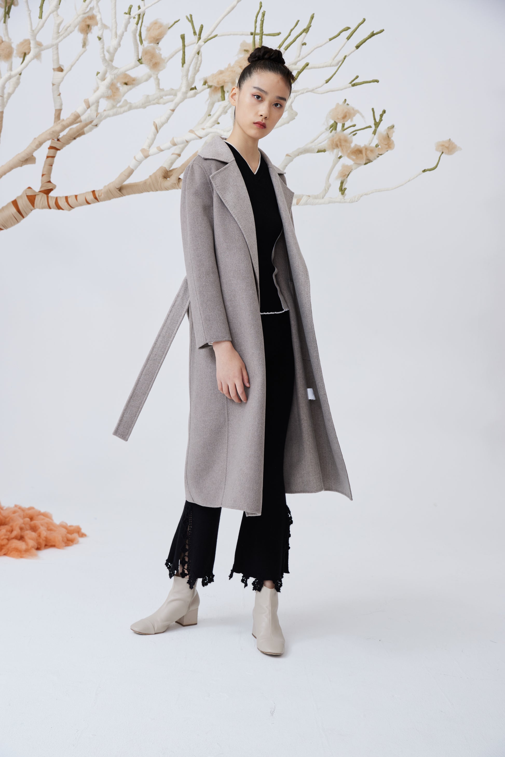 Indulge in the luxury of our double-sided cashmere coat. Its elongated silhouette with high back splits create a striking, modern look. The off-the-shoulder necklines and meticulous hand-sewn details add a touch of refined elegance.