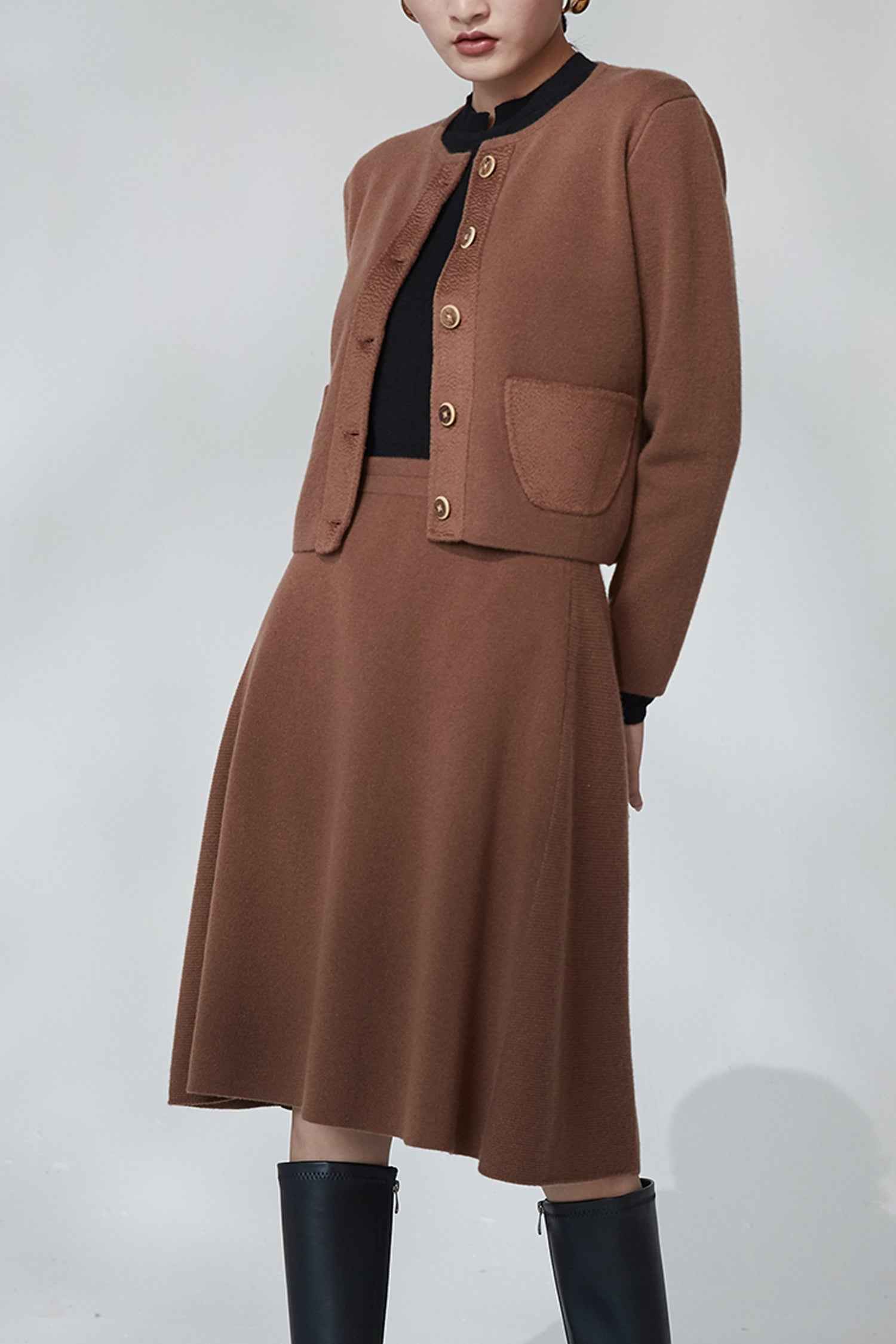 Flared skirt rib knitted from 26S/2 extra thick baby cashmere, with a double elastic waistband. Knee length with a sleek line, this is a soft, very feminine piece.