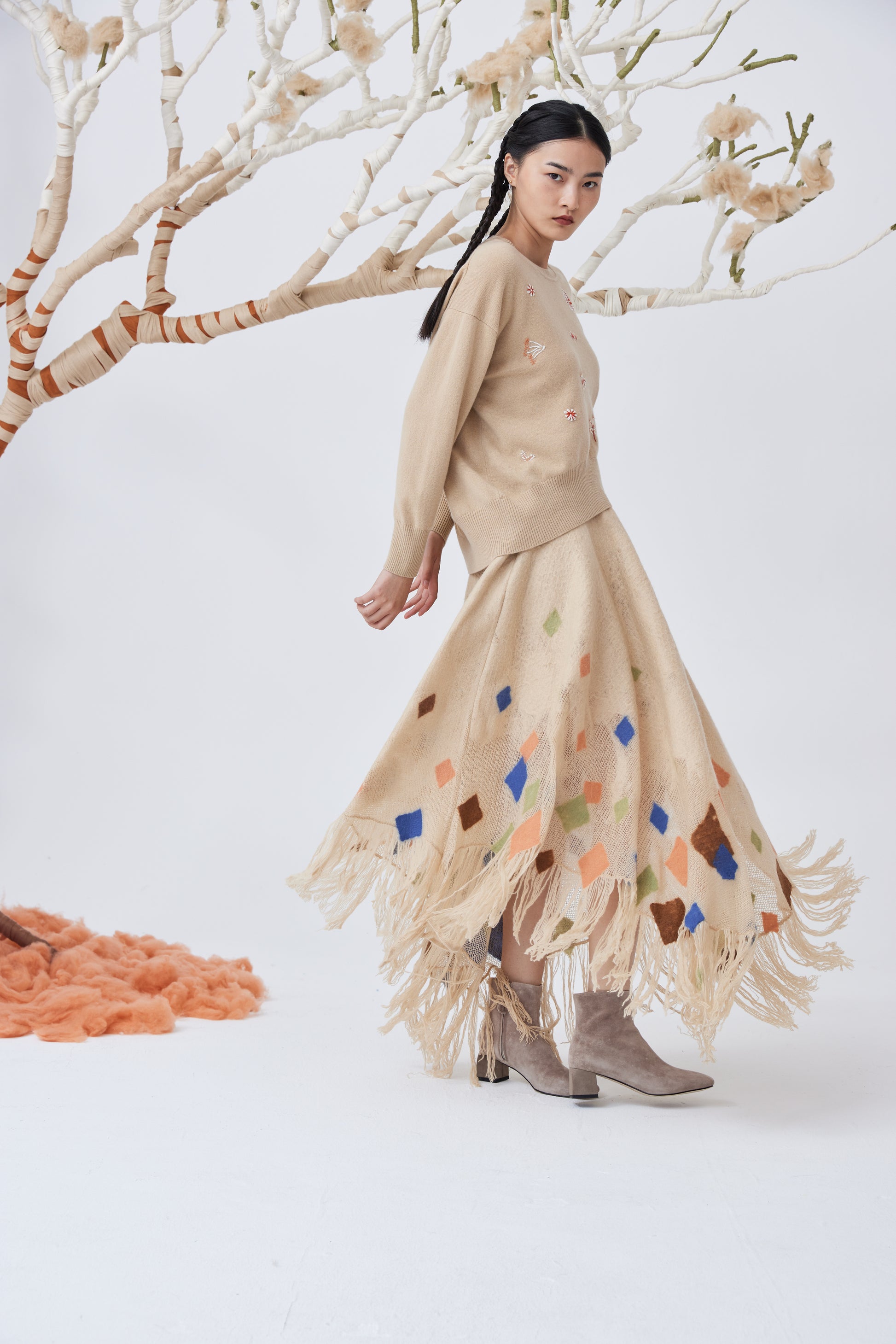 Unique traditional Mongolian handcrafted cashmere felting skirt on top of knitted cashmere fabric. Handmade tassels with a flared at the hem. Multi-colored argyle pattern made by wasted materials during the production of other ready-to-wear items. An artistic handcraft.