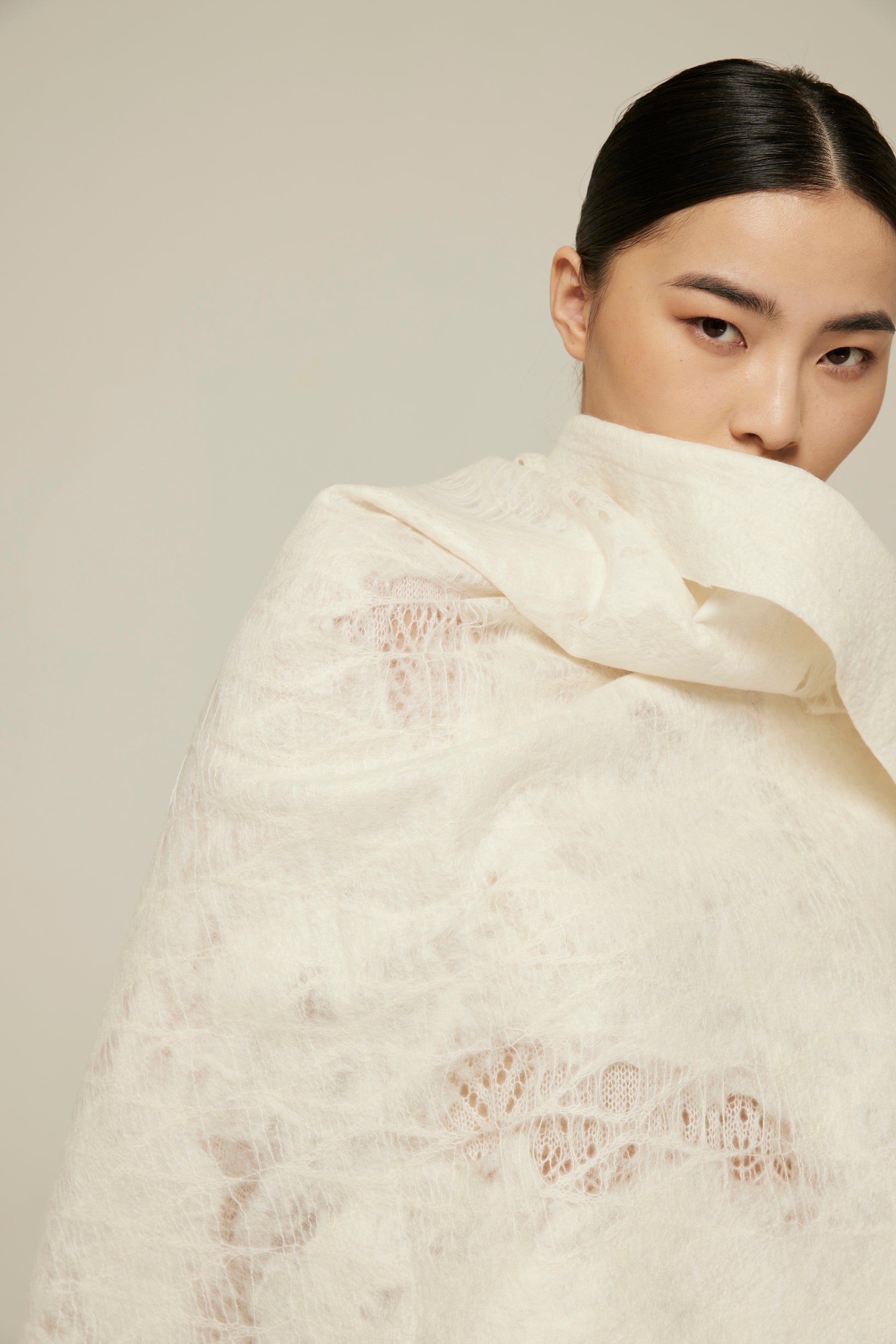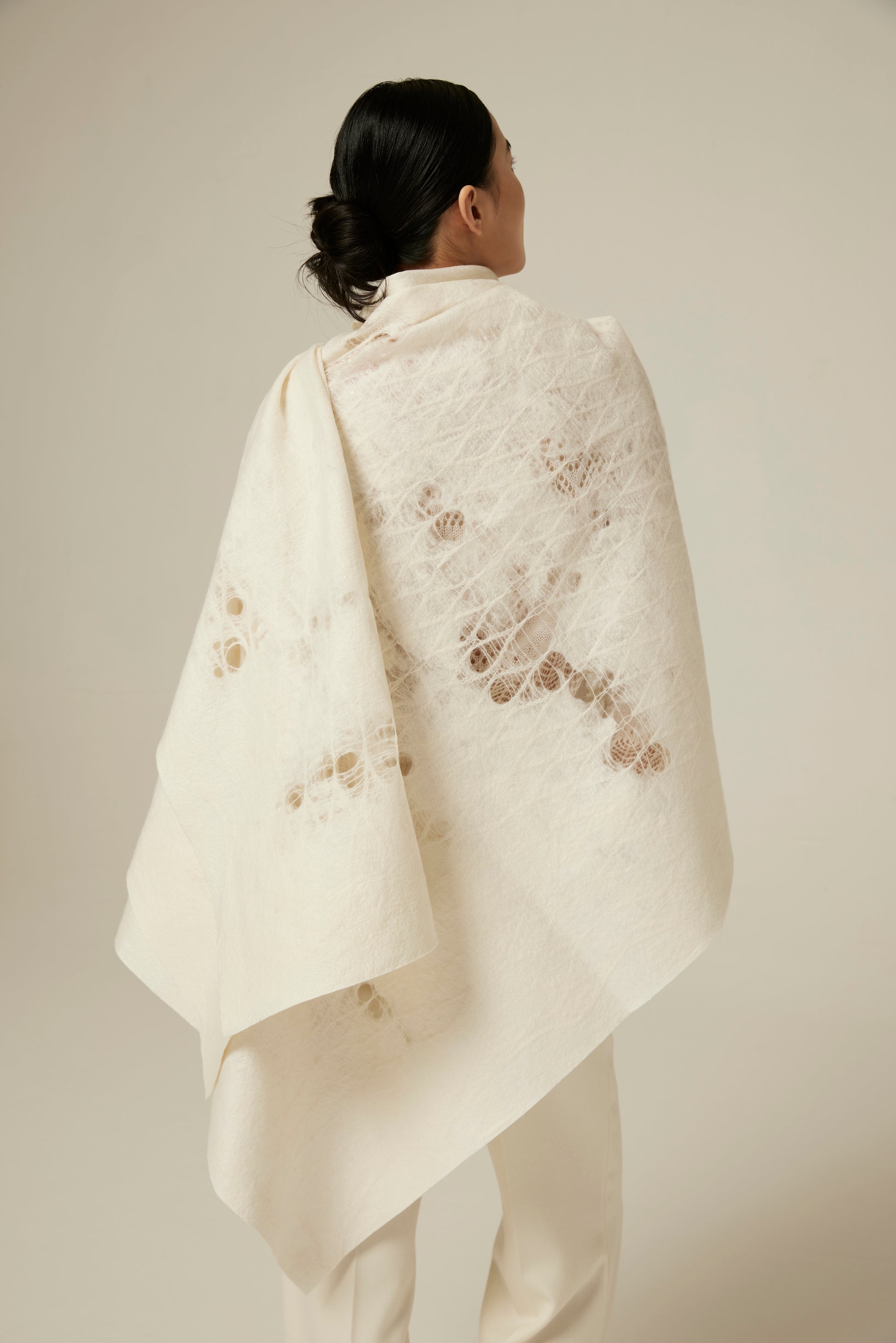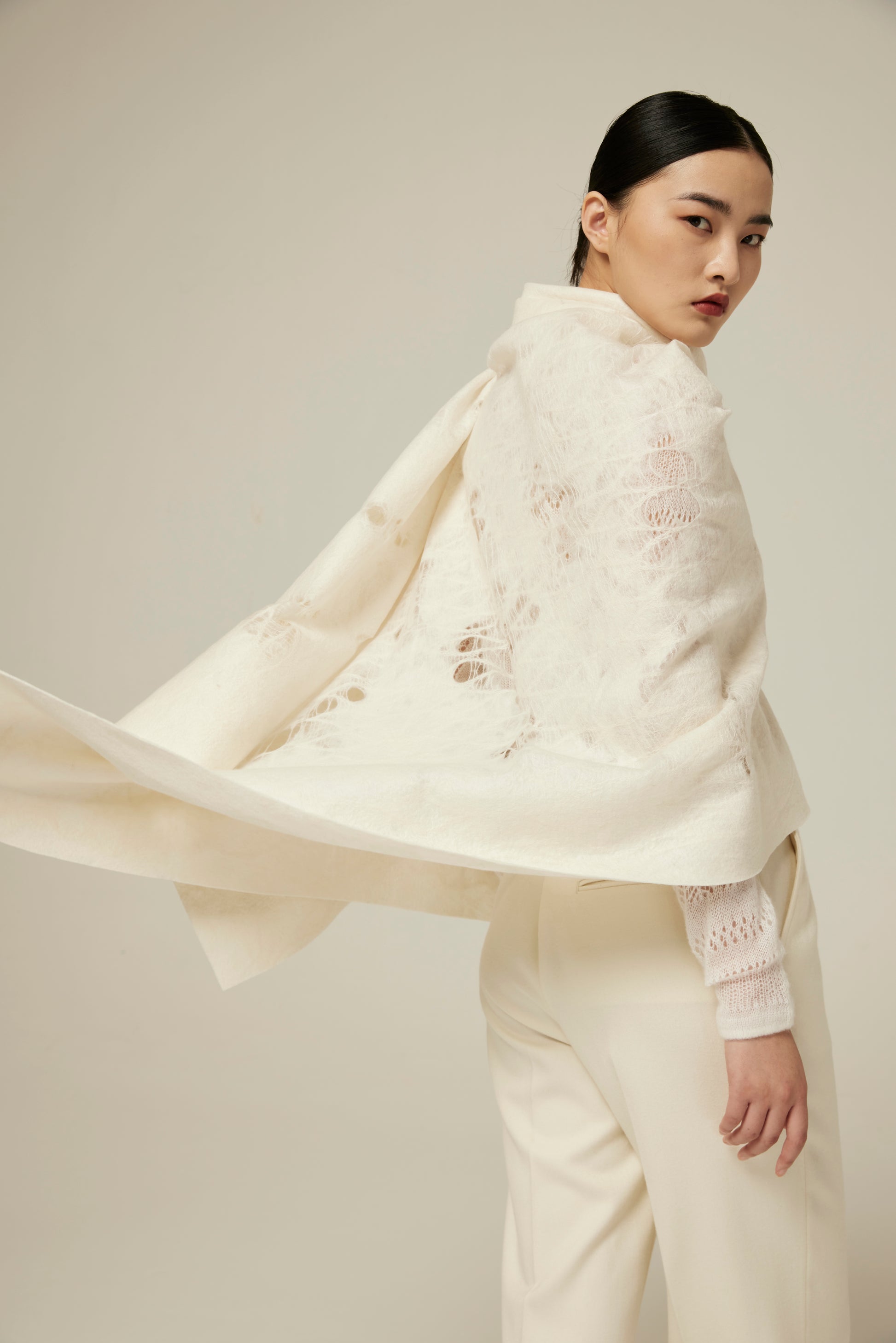 Unique traditional Mongolian handcrafted cashmere felt on top of knitted cashmere fabric. Decorated by white cashmere randomly that come from the wasted materials during the production of the entire collection. An artistic handcraft with the idea of sustainable fashion.