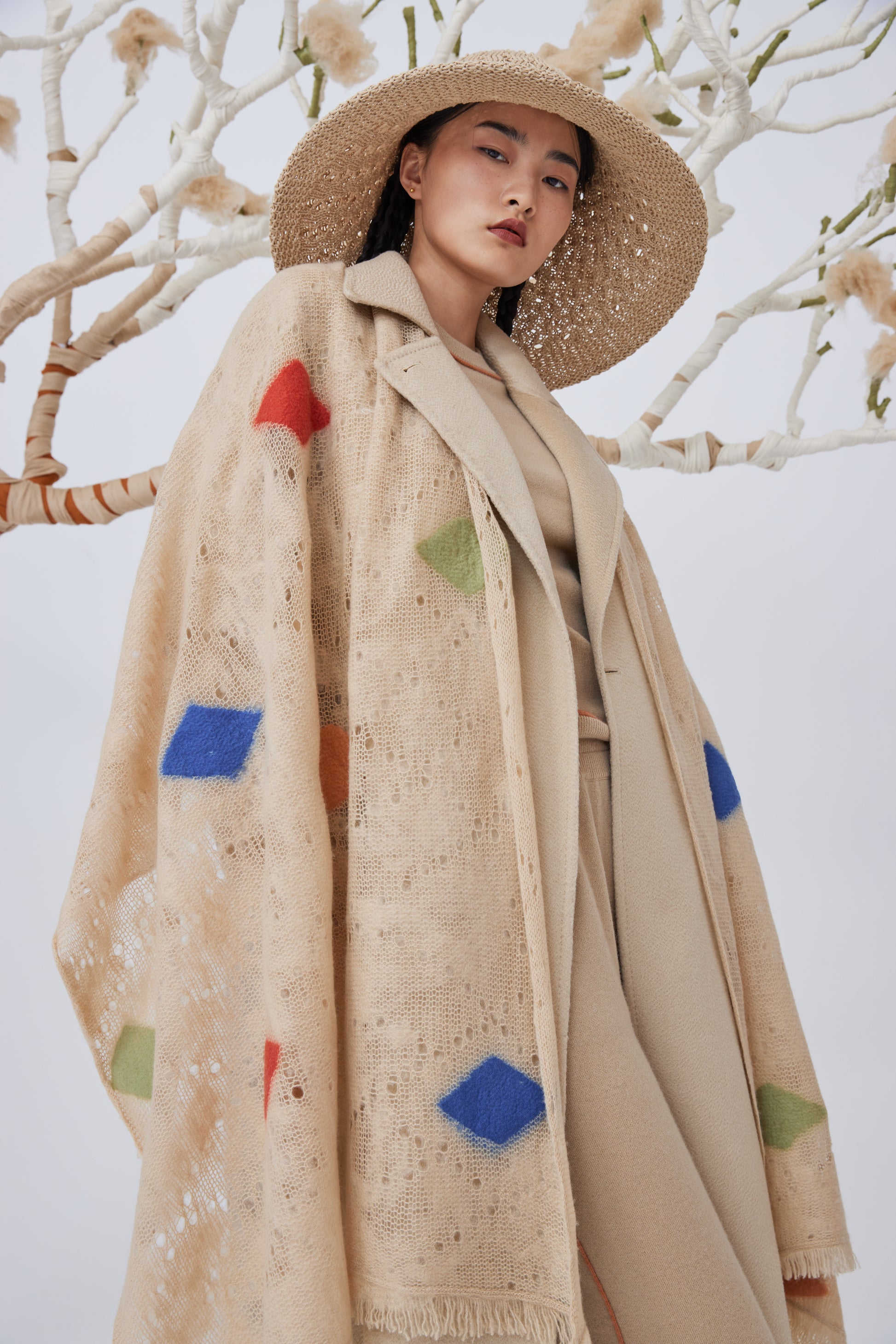 Unique traditional Mongolian handcrafted cashmere felt on top of knitted cashmere fabric. Decorated by multi-color blocks that come from the wasted materials during the production of the entire collection. An artistic handcraft with the idea of sustainable fashion.