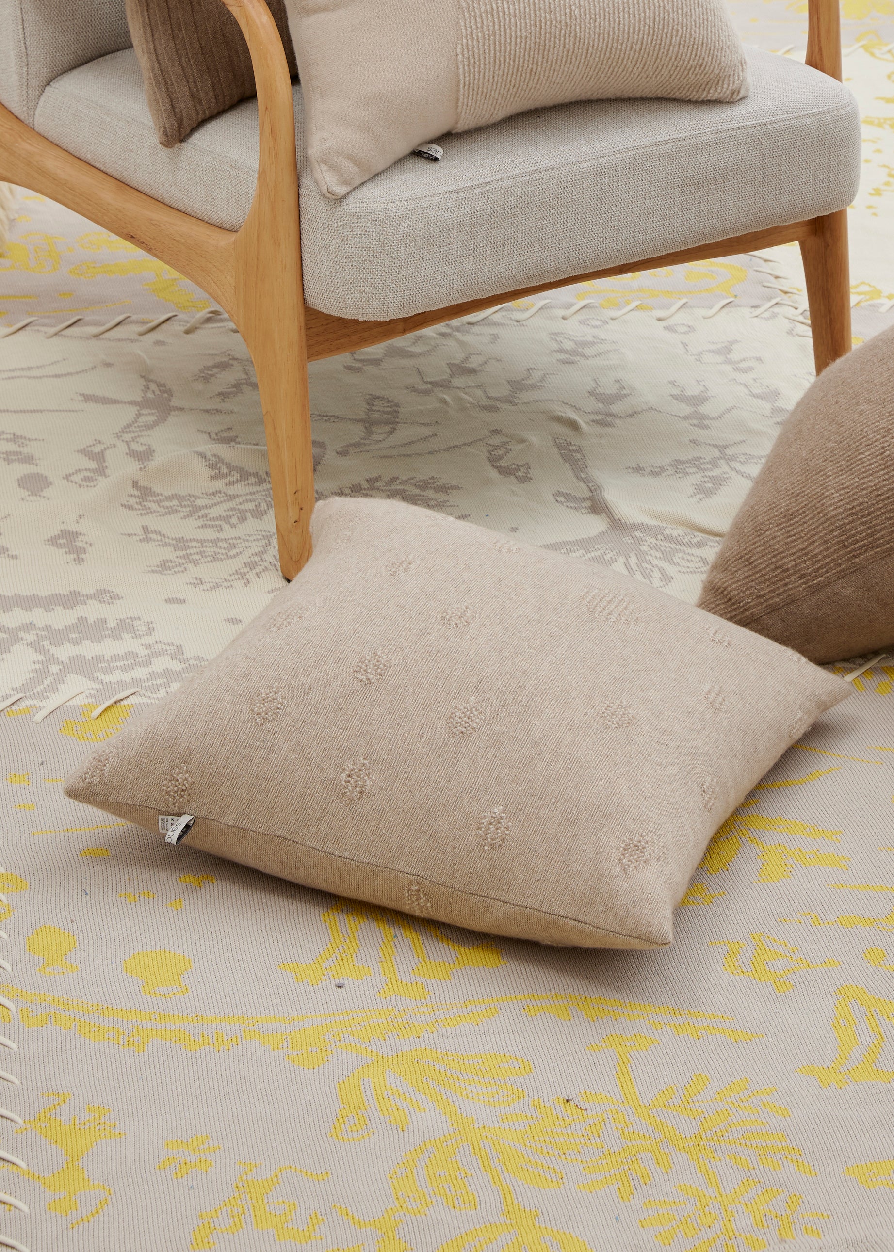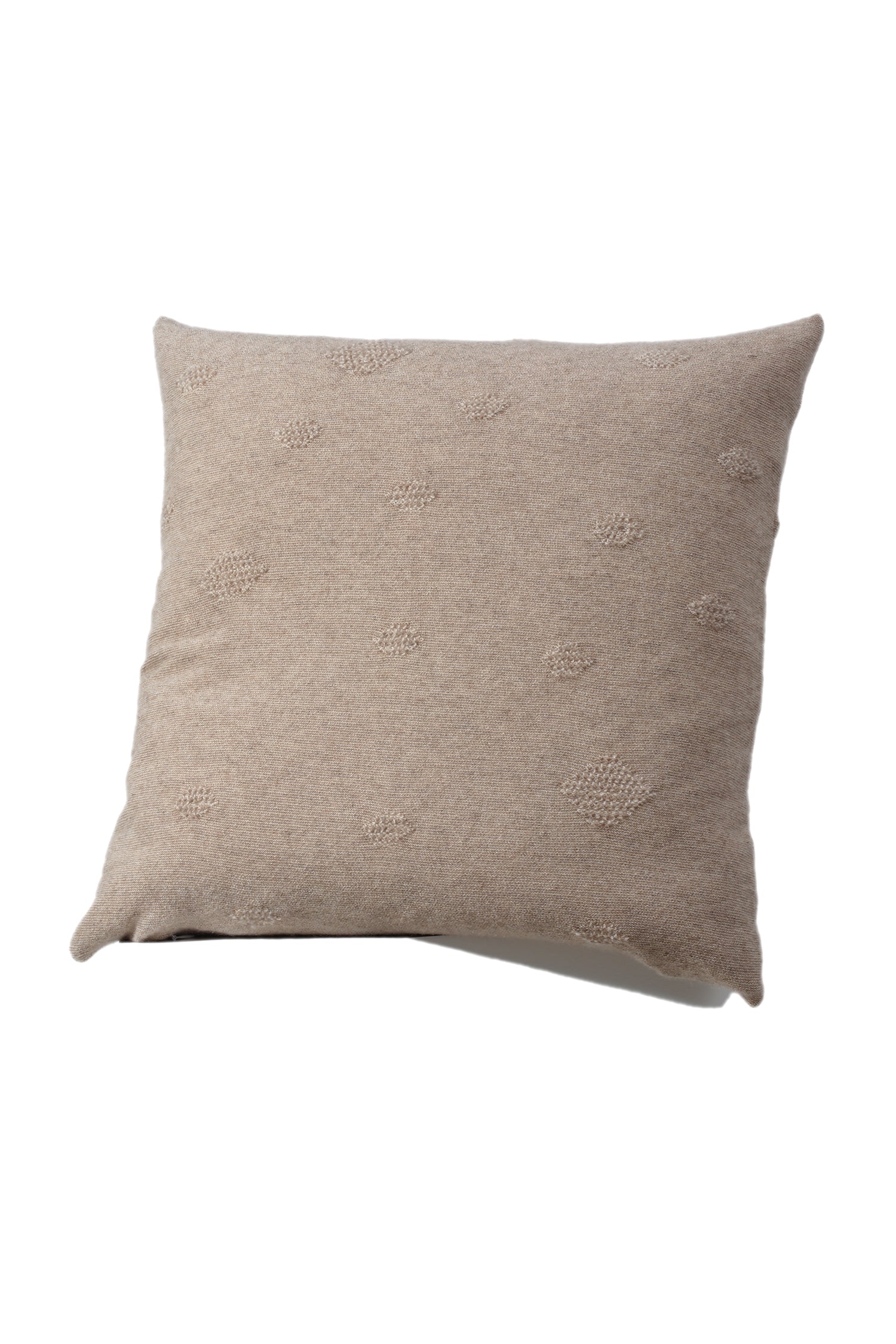 A soft pure cashmere square cushion, featuring dotted texture. Relatively light weight, natural and warm color, a perfect fit for domestic life and travel.