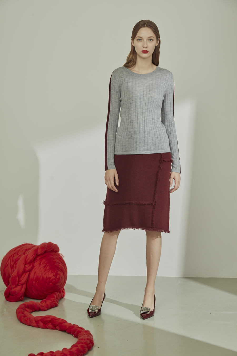 Ribbed stitch crew neck jumper decorated with stripe along arms. Fitted silhouette.