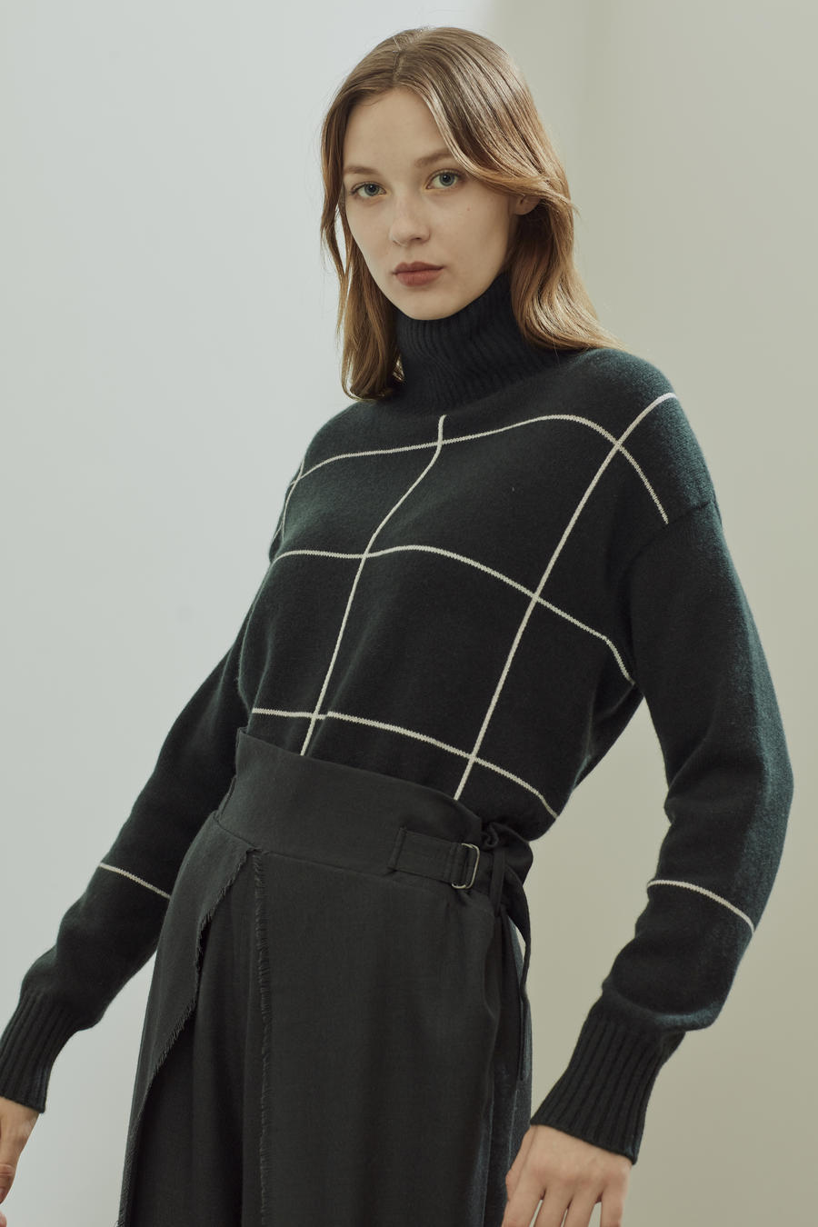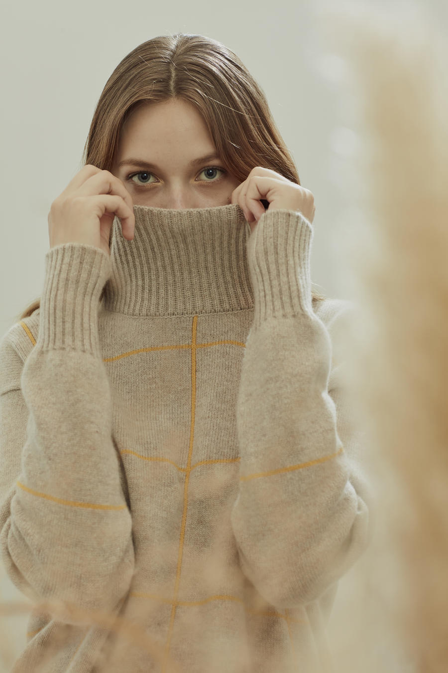 Turtleneck pure cashmere jumper with simple yellow check patterns, ends with ribbed asymmetric hem and a small slit on the side.