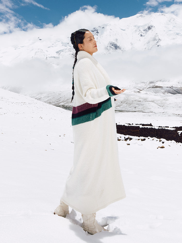 Artfully crafted with a contrast-color jacquard panel at the waist, this piece combines intricate embroidery with a deceptively simple yet meticulously crafted design. A subtle jacquard texture emerges throughout the main fabric, while the placket and cuffs feature raised towel embroidery—rich, three-dimensional, and a testament to exquisite Tibetan artistry. Fully hand-linked for a seamless, flat finish, it delivers refined warmth and exceptional detail.