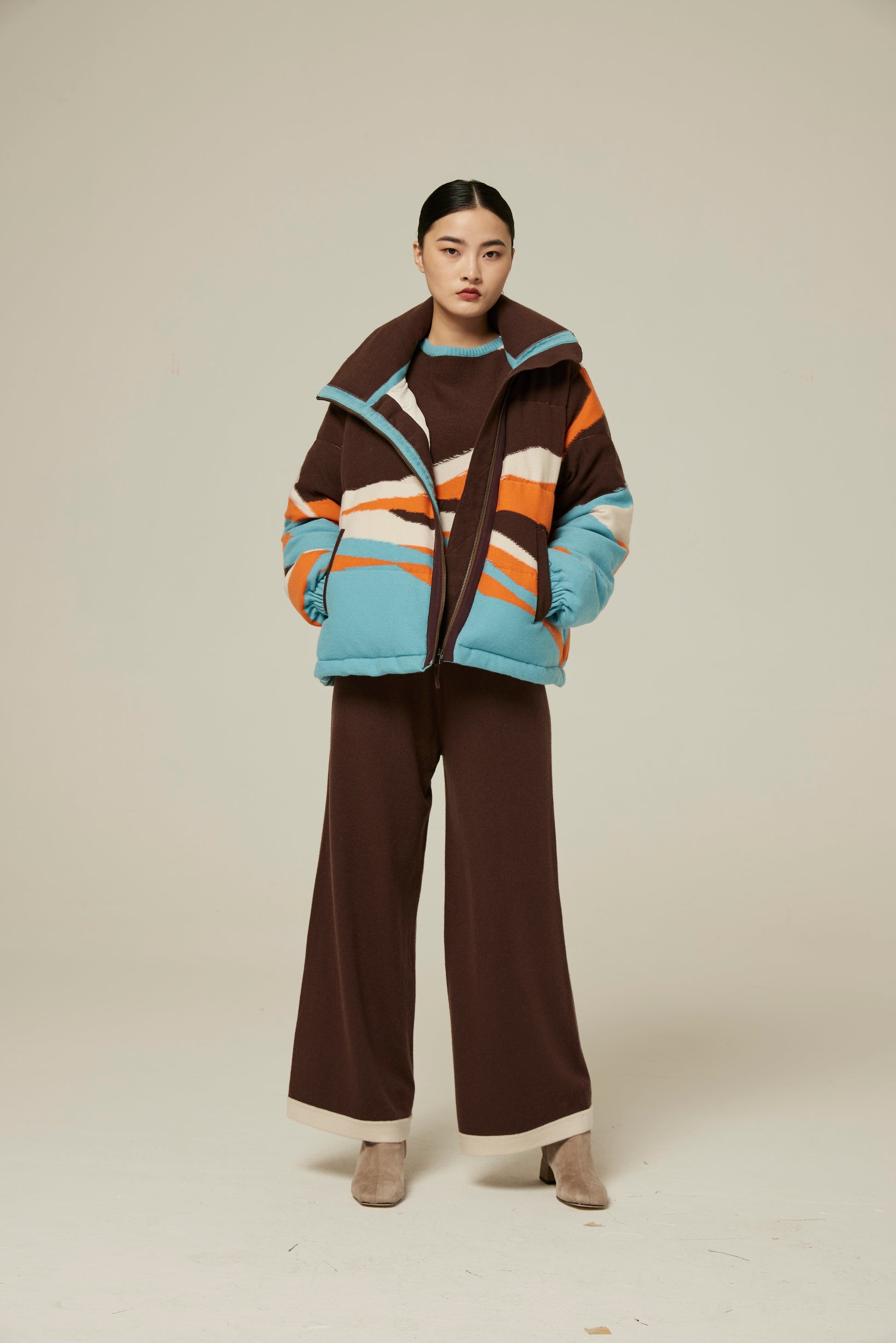 Pure cashmere covered puffer jacket, concealed front zip fastening, featuring elasticated hem. Logo knitted on the chest.