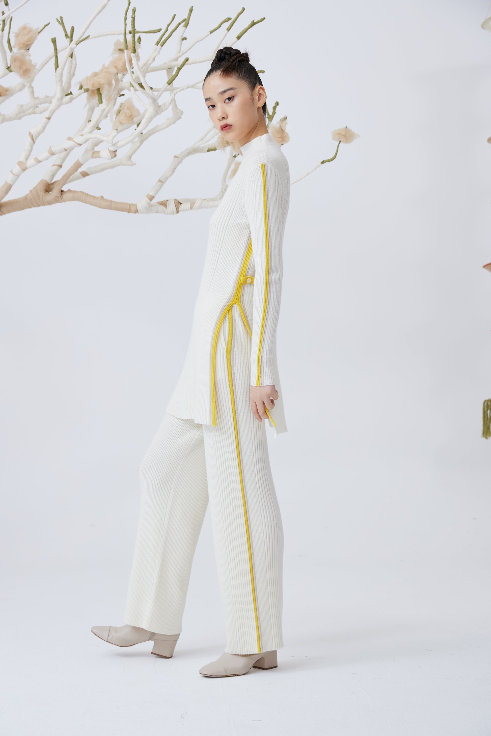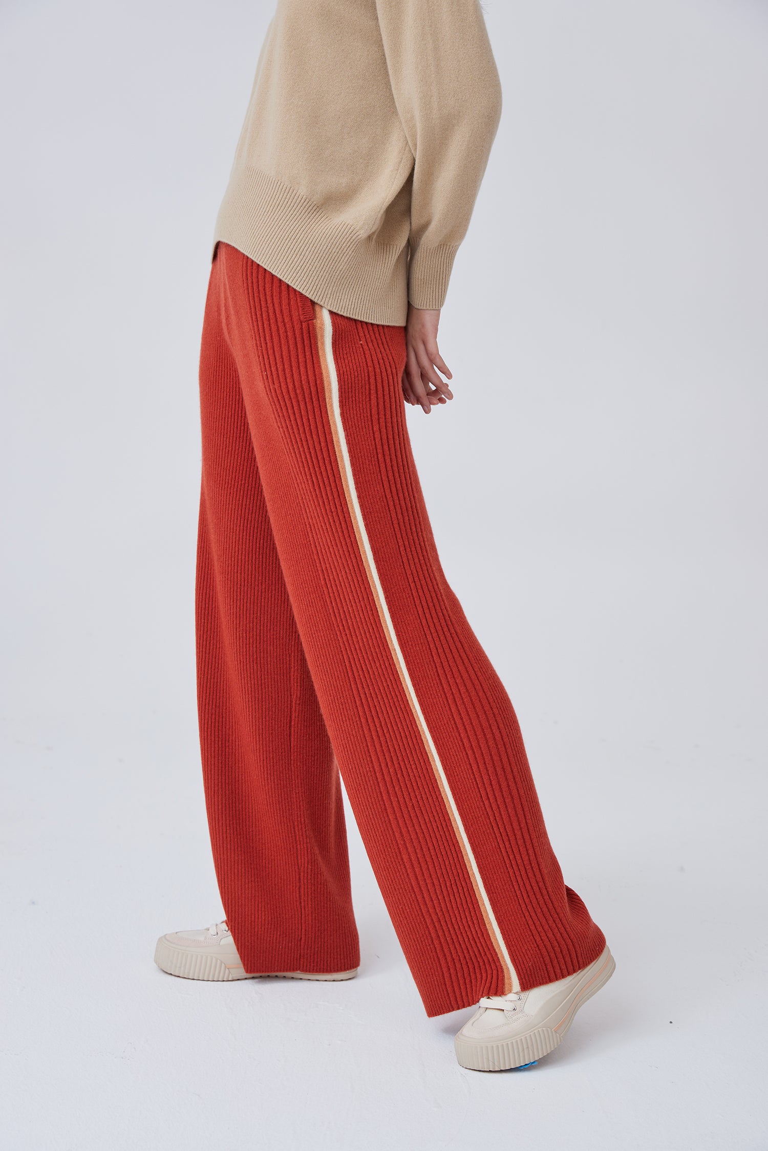 100% cashmere ribbed-knit trousers with elastic waist and colored side strips.