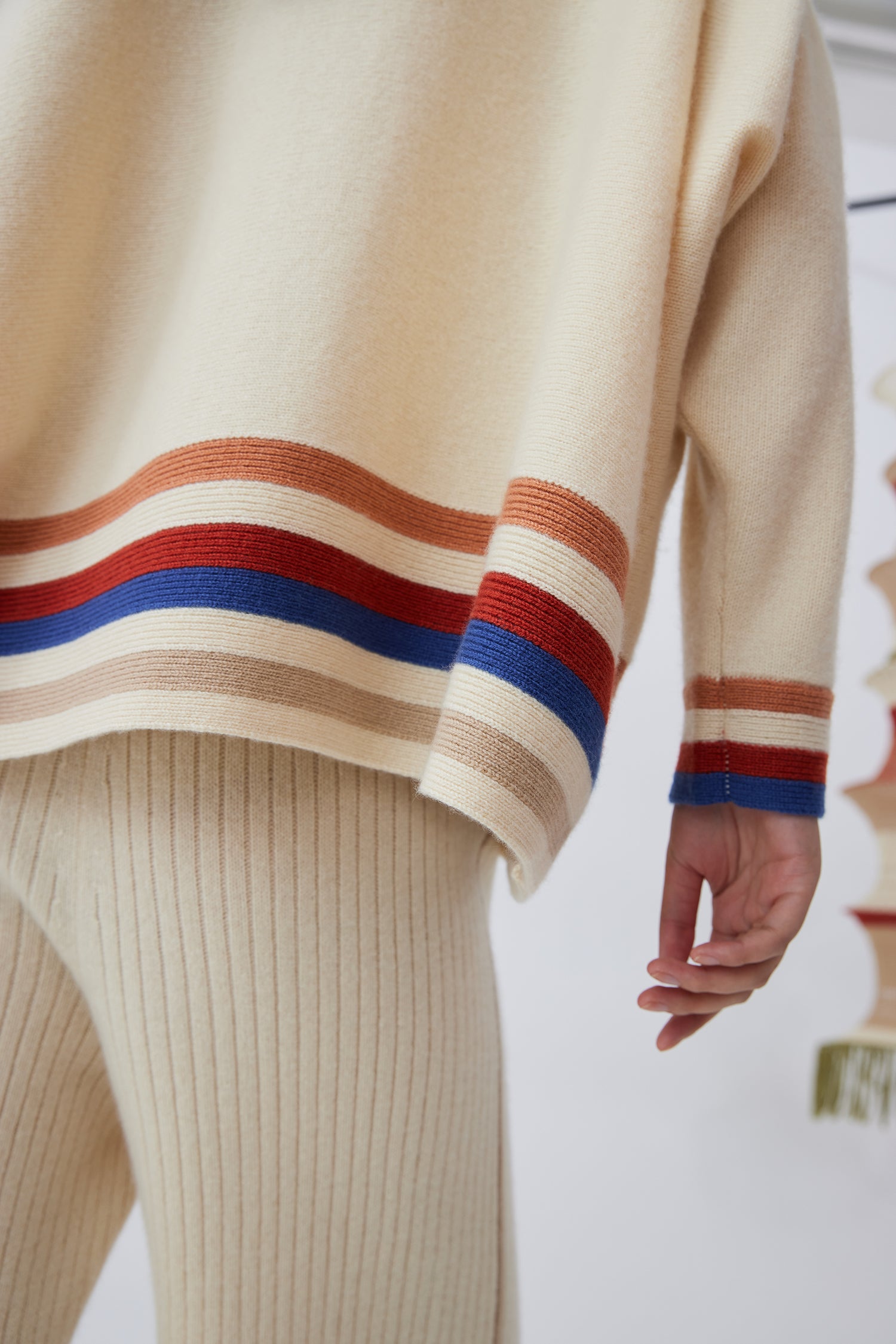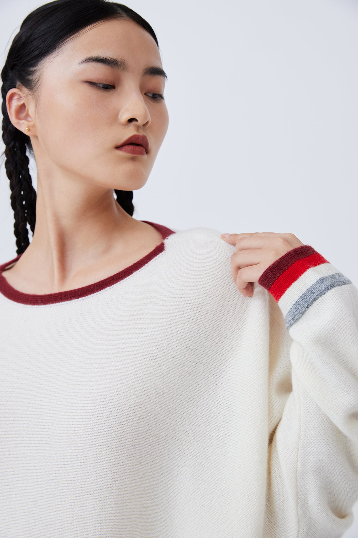Pure cashmere crew neck top featuring long sleeves, an oversized cloak top with stripe hem, ribbed-knit.