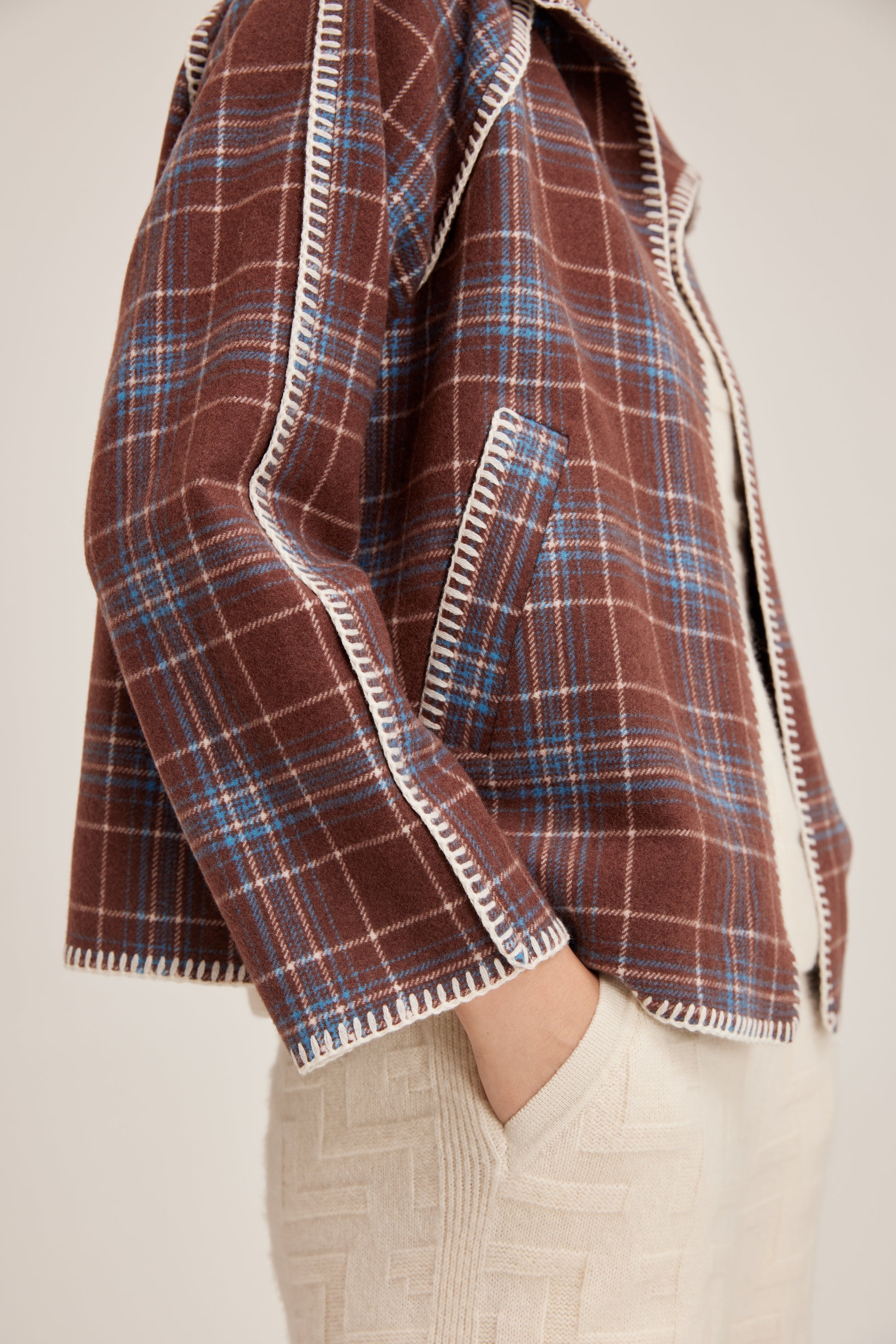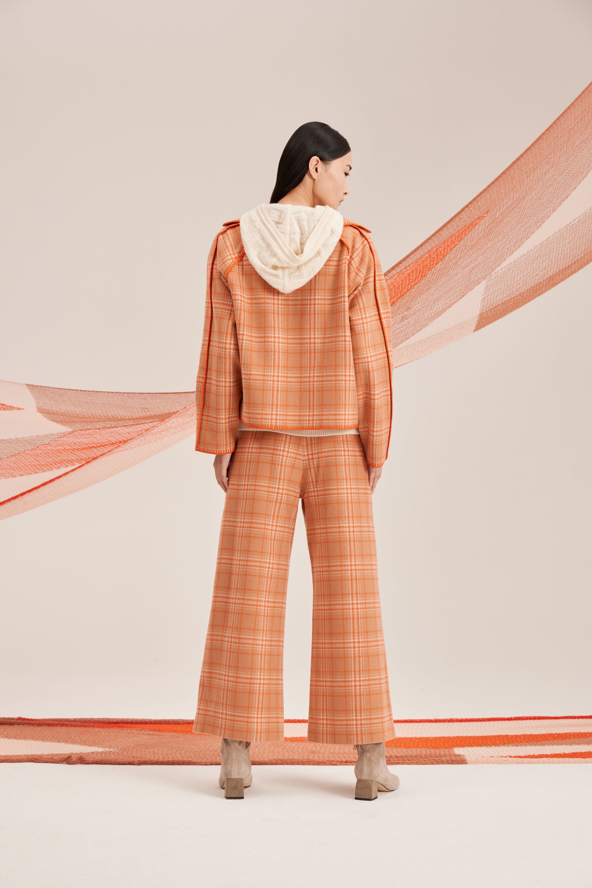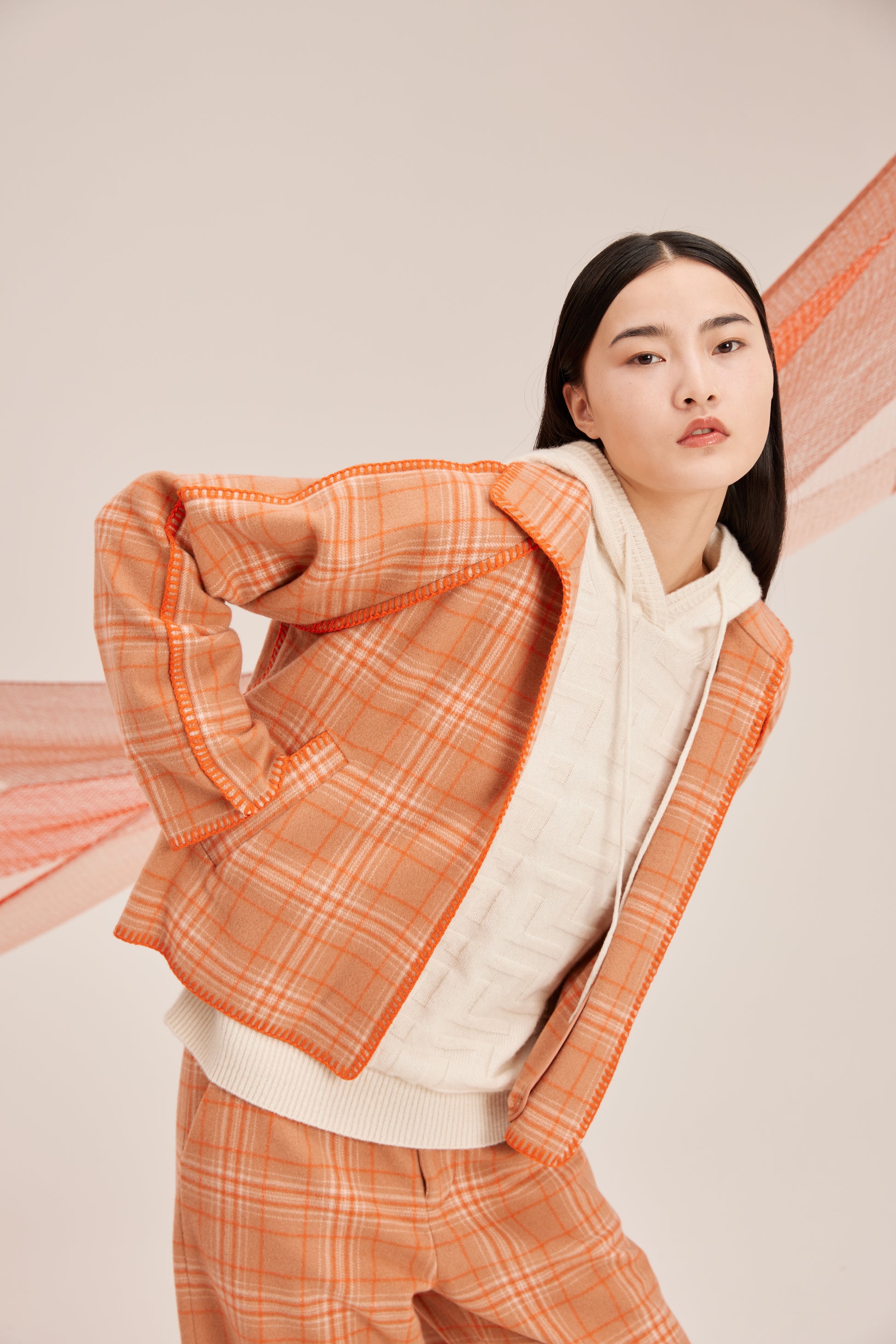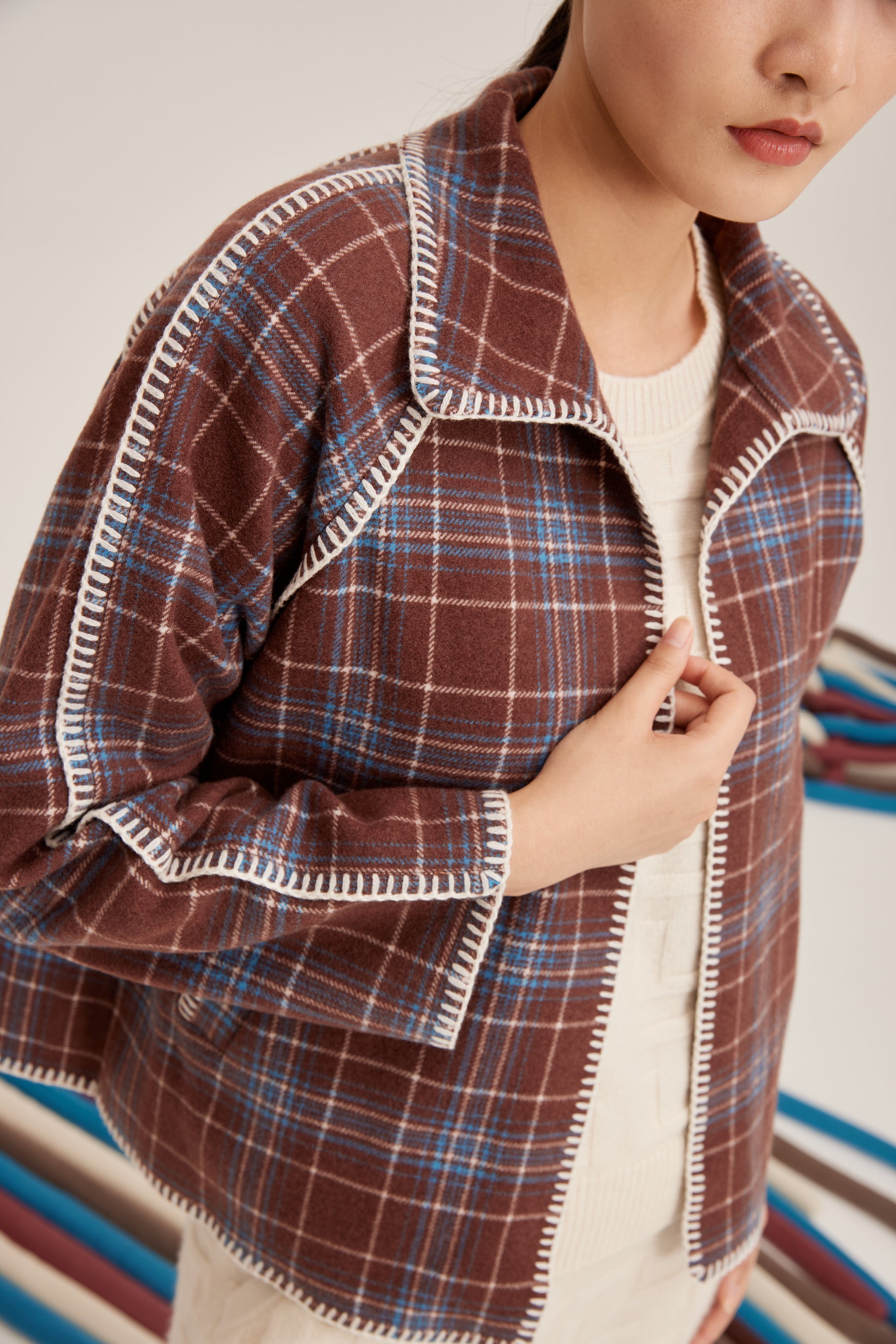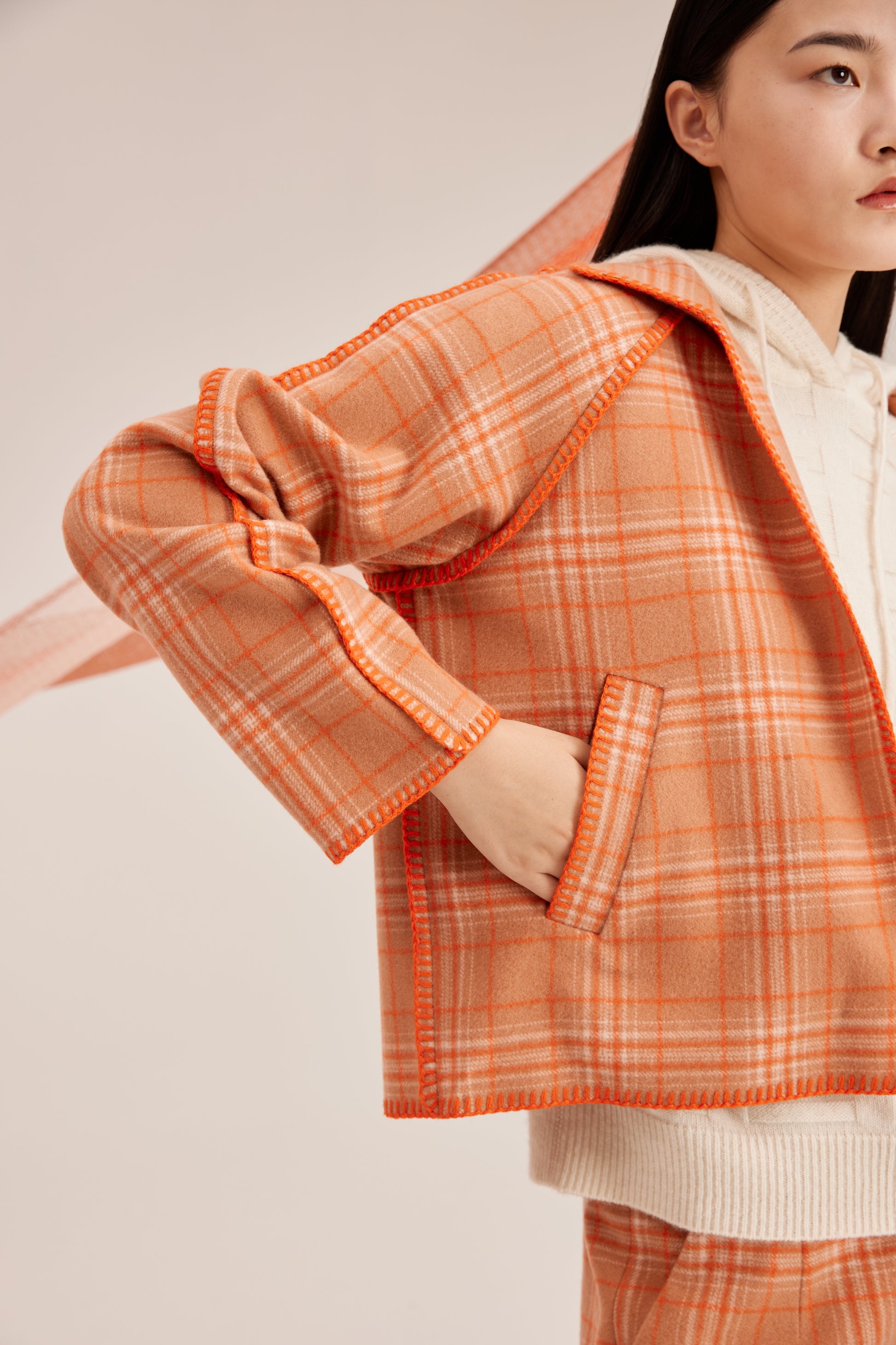 Pure cashmere check pattern coat, turn-down collar, loose fit.