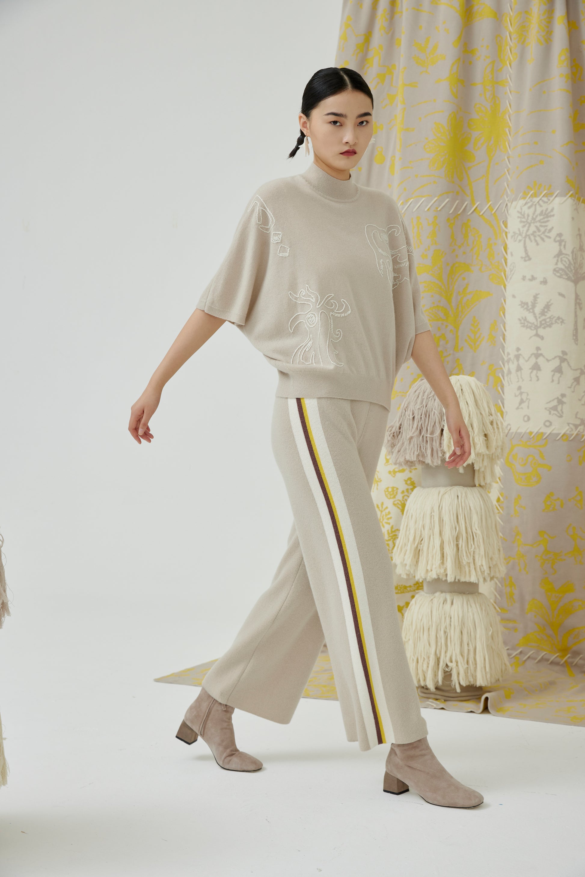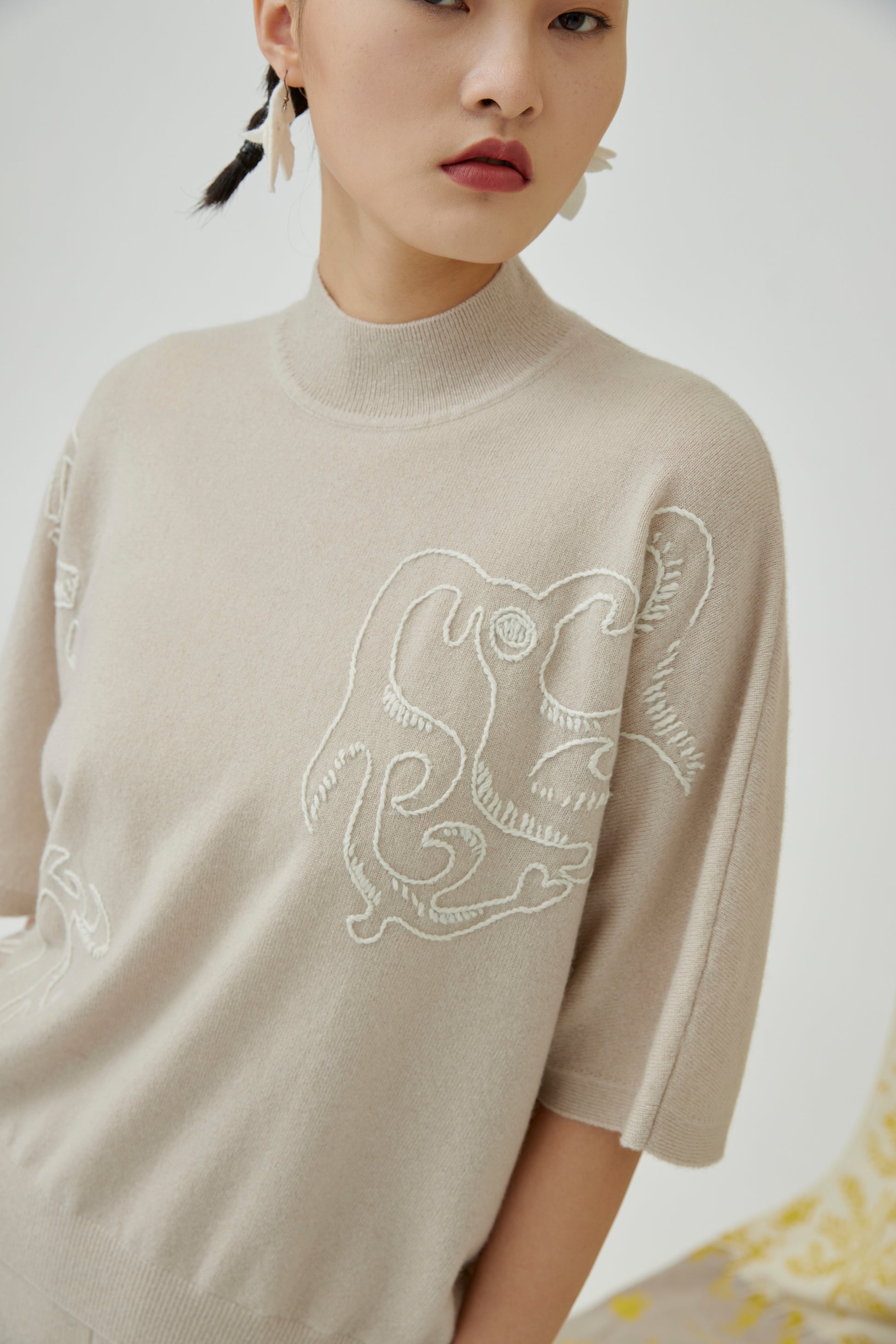 100% cashmere cloak-shaped sweater featuring a roll neck, with handmade embroidered pattern of traditional phoenix. Part of the "Girls for Girls" women supporting project of Sandriver.