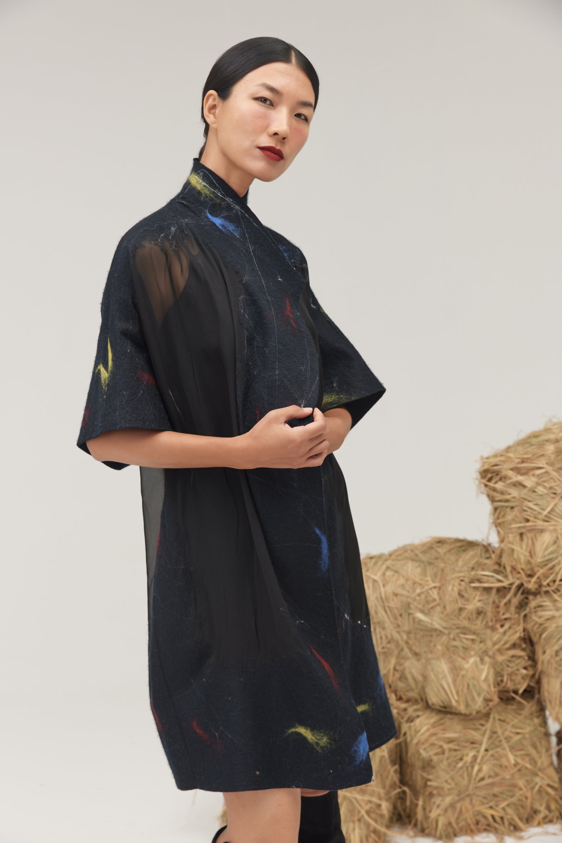 Unique tradital monglian handcrafted cashmere felt on top of silk-cashmere fabric. Decorated by colored cashmere randomly that com e from the wasted material during the production of the entire collection. An artistic handcraft with idea of sustainable fashion.