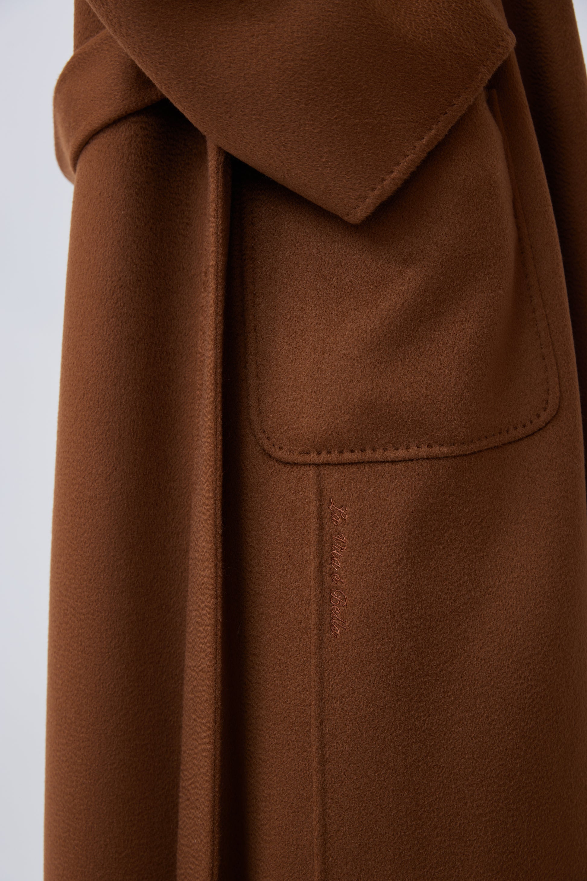 Hand-sewn long cut pure sable cashmere coat, super-thick featuring long raglan sleeves. Detailed handcrafted embroidered slogan "La Vita è Belle". Matching belt fastening.