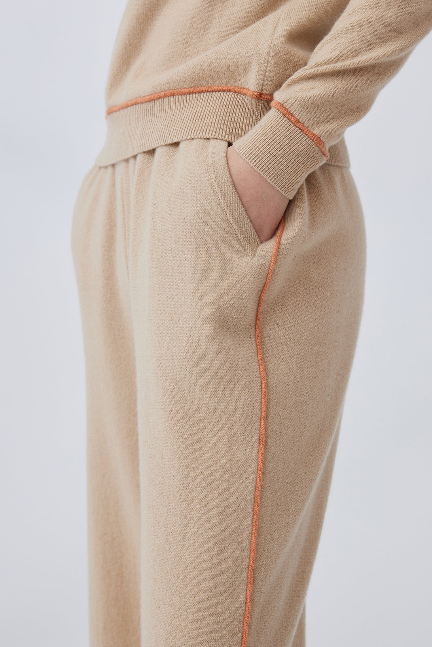 100% cashmere, stretched and knitted straight-leg trousers with slant side pockets. Colored stripes on the sides, and elastic waist.