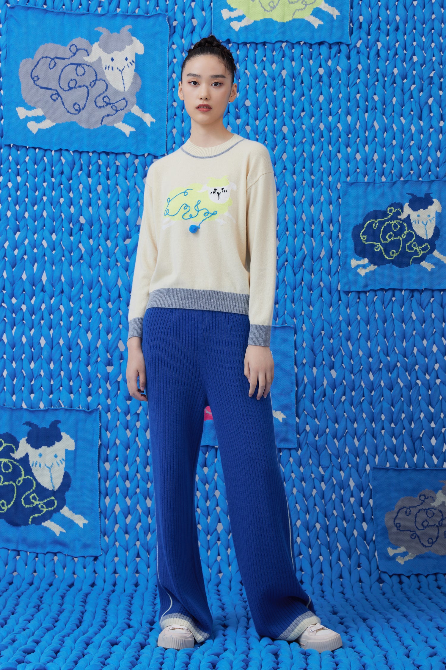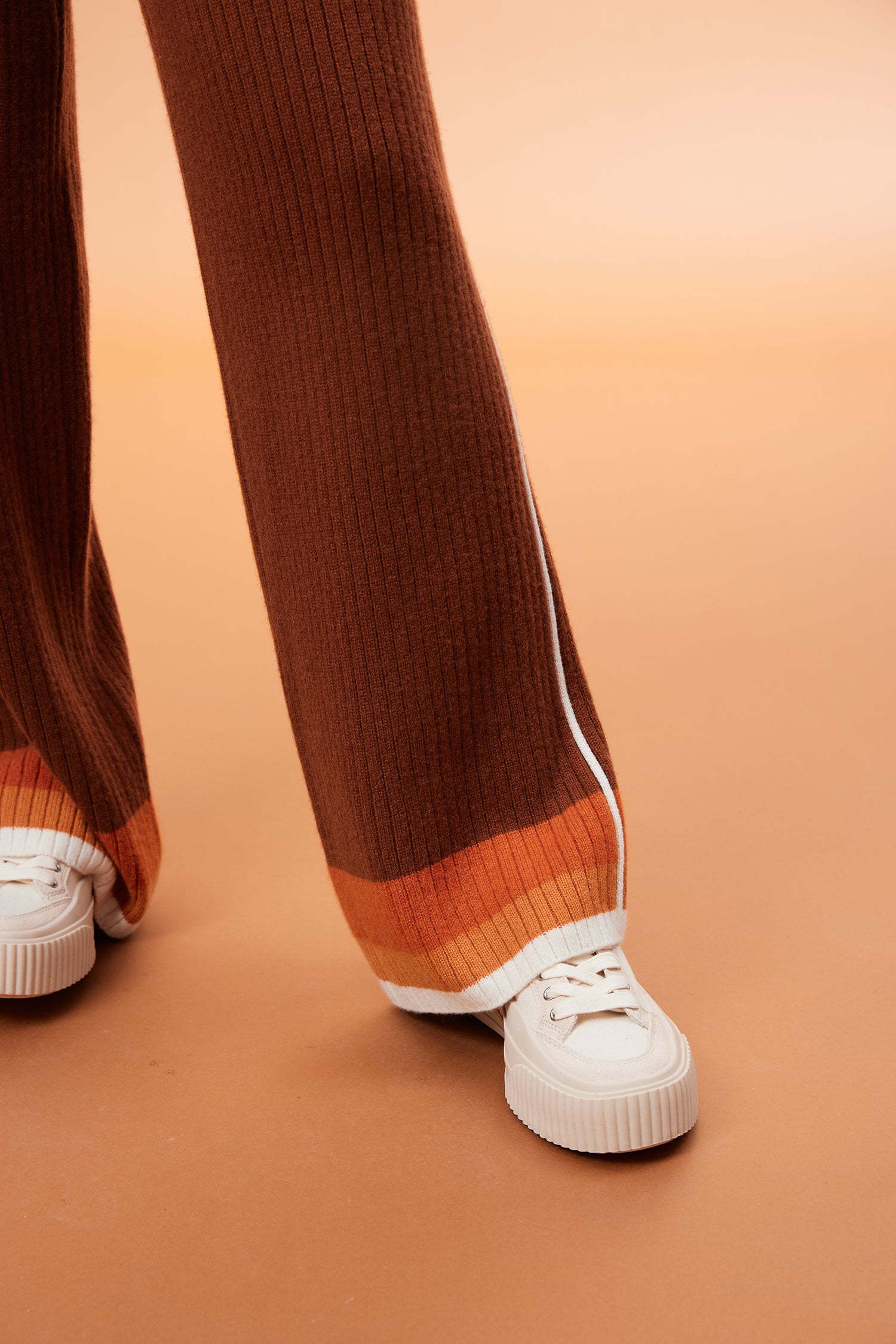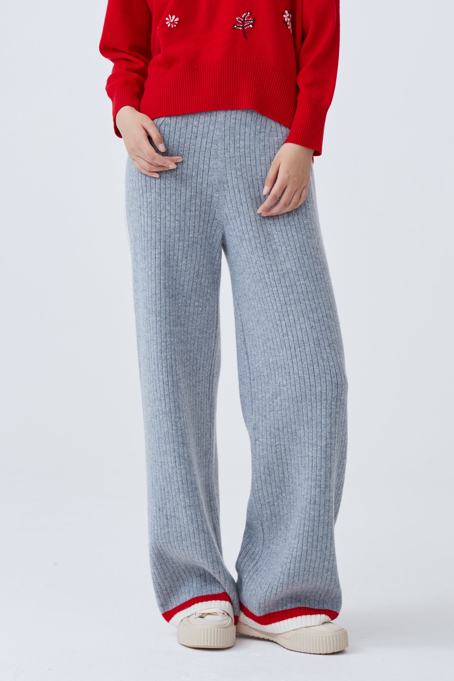 100% cashmere ribbed-knit streched trousers with elastic waist and colored side strips. Multi-colored blocks at the hem, slant pockets