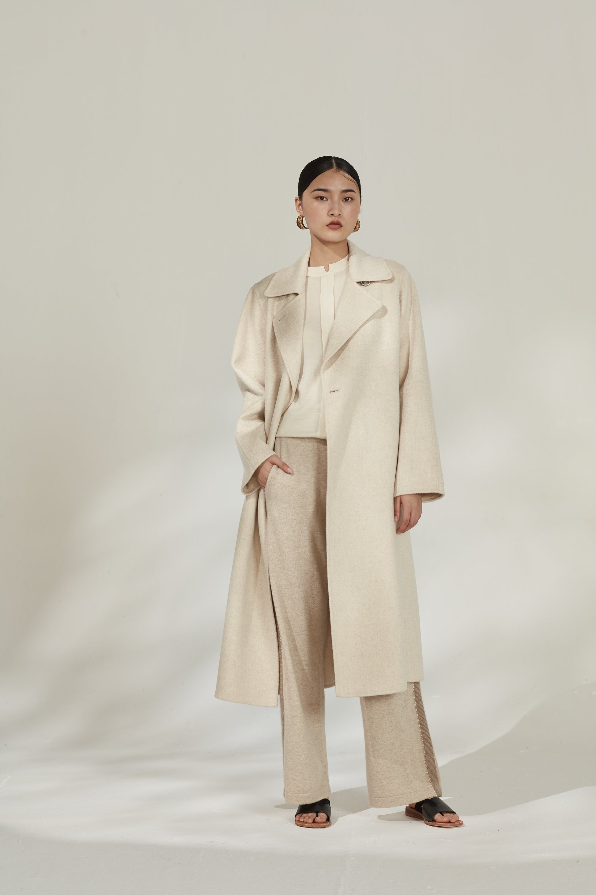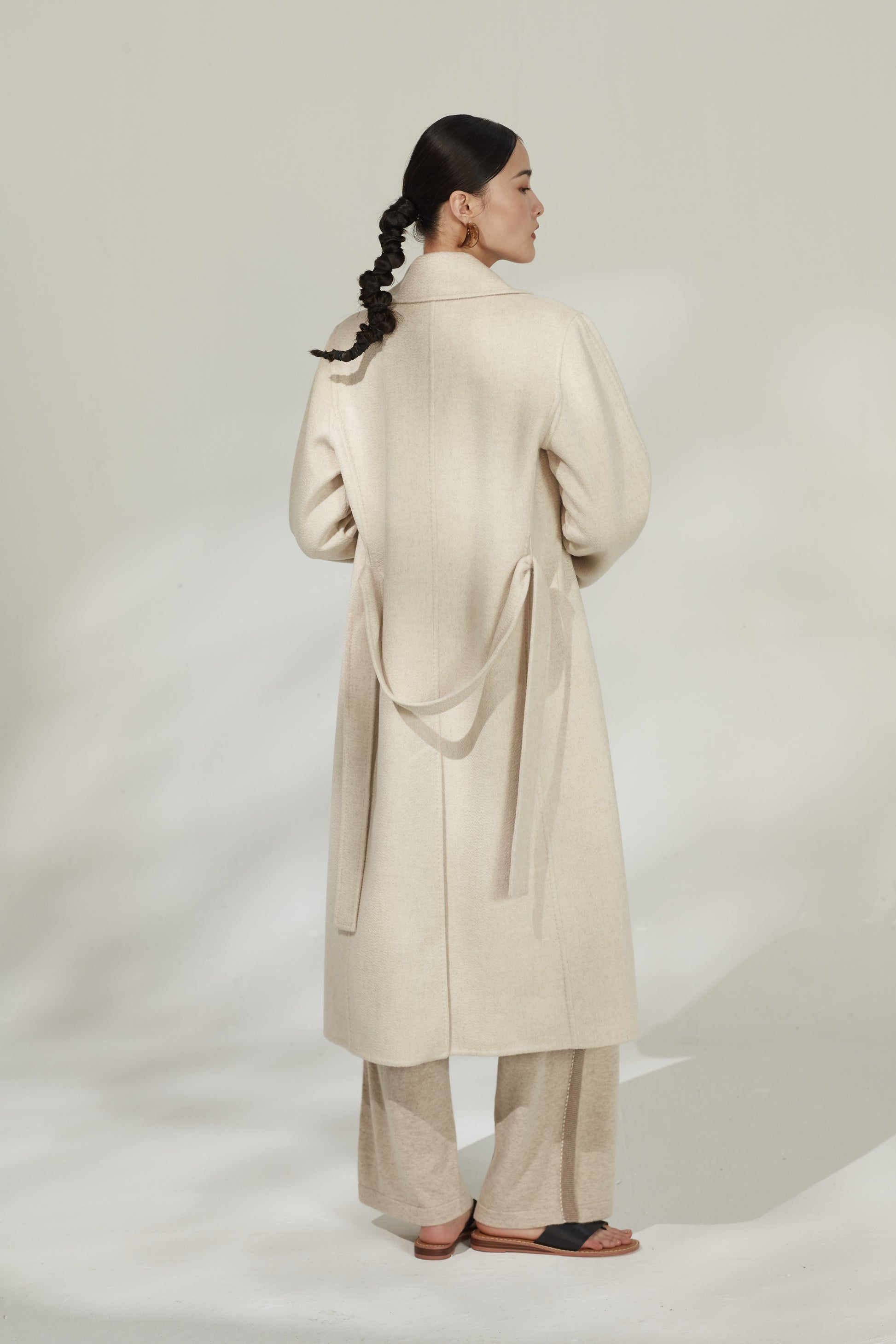 Double-faced long sable cashmere coat, hand-sewn straight cut, with slash pockets. Matching belt fastening.