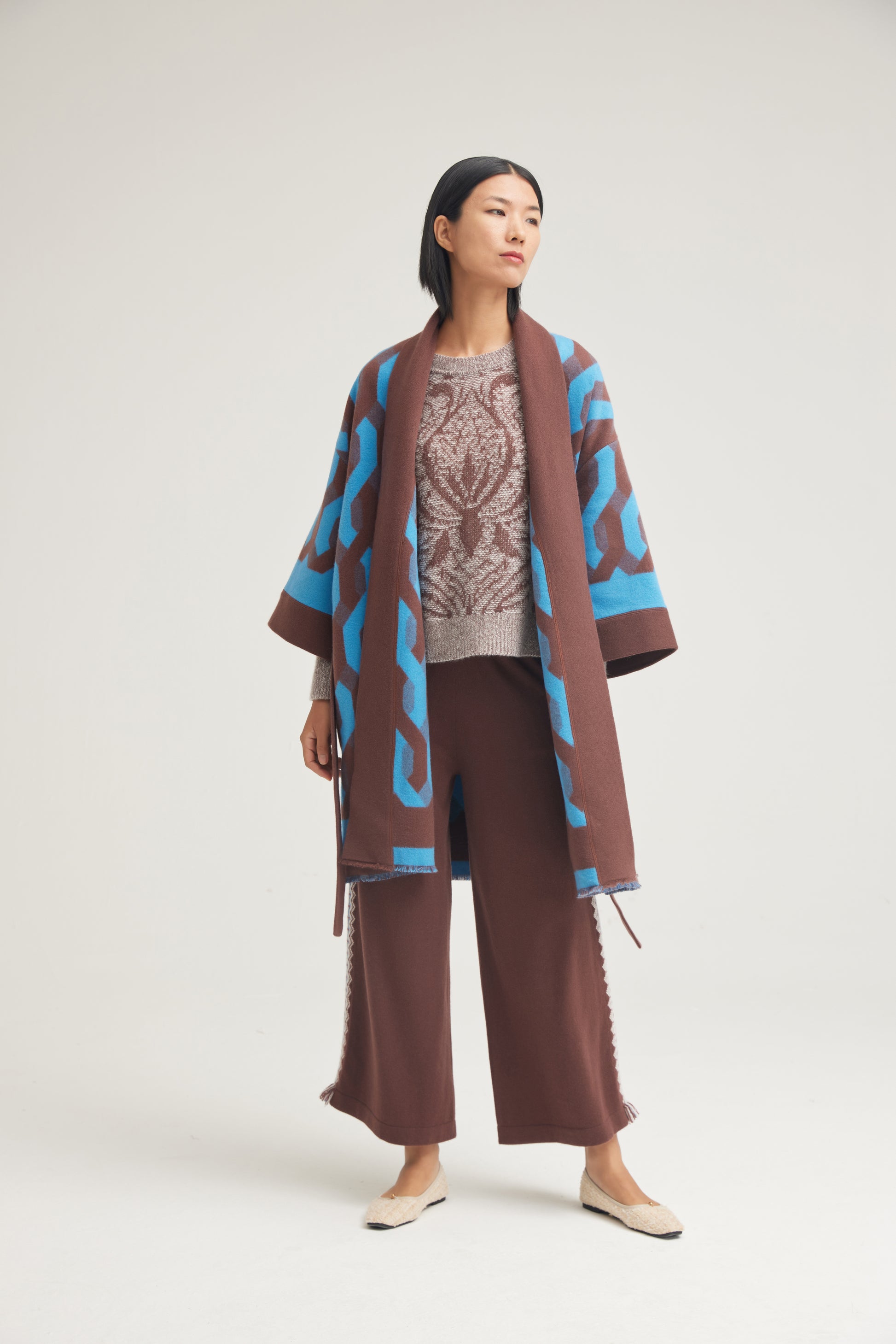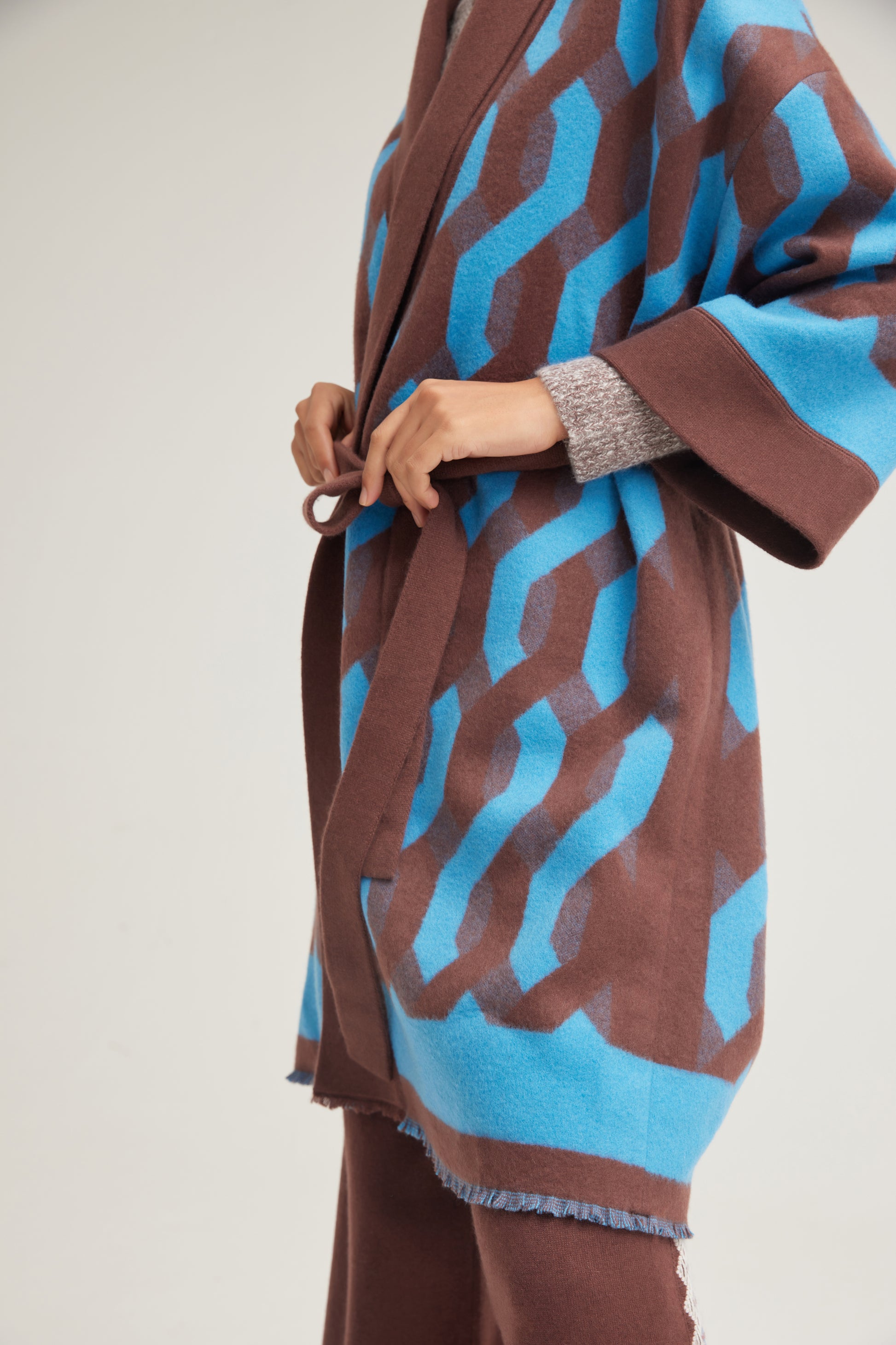 Pure cahsmere coat designed in two-color woven jacquard featuring hem fringe, elegant and fashionable