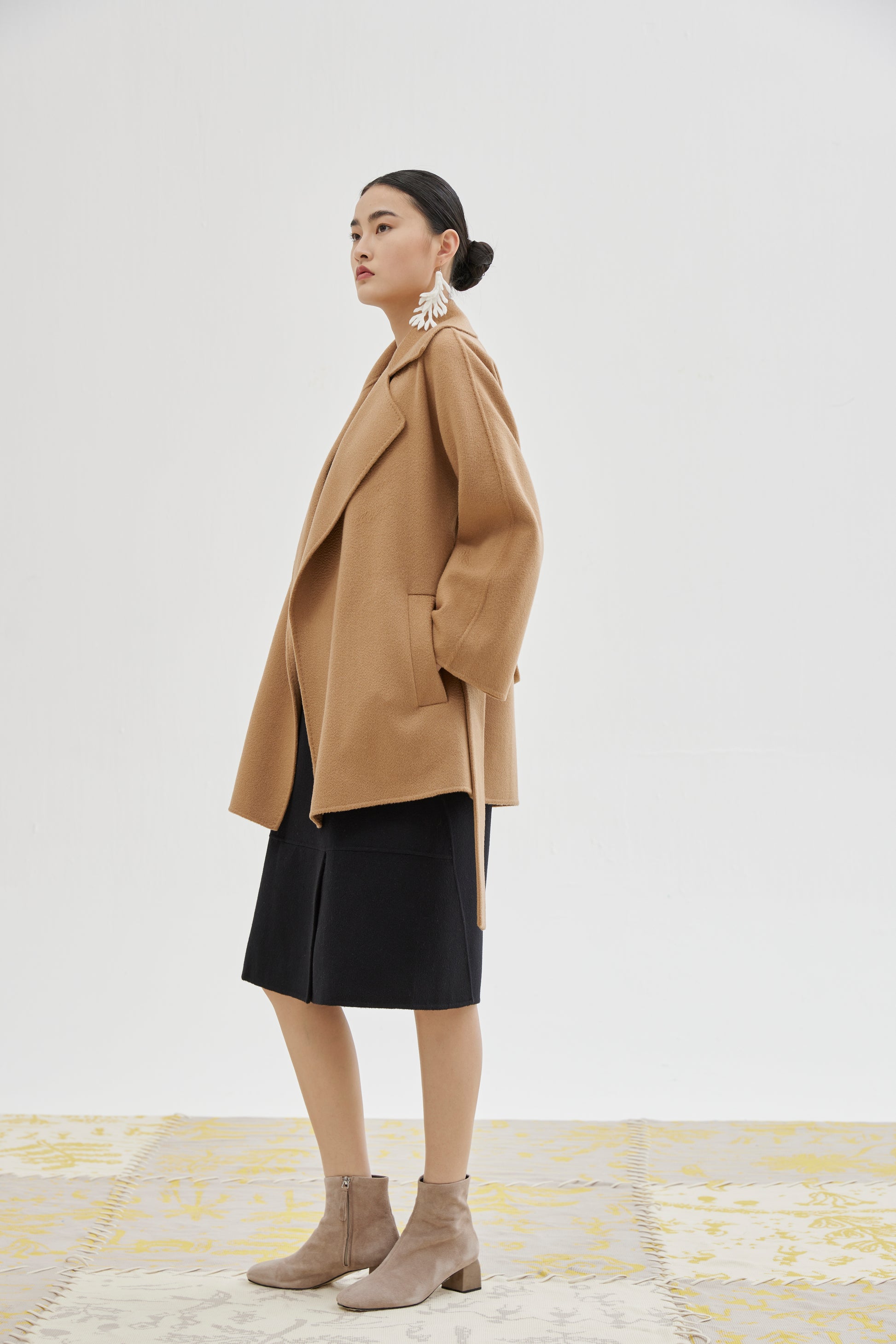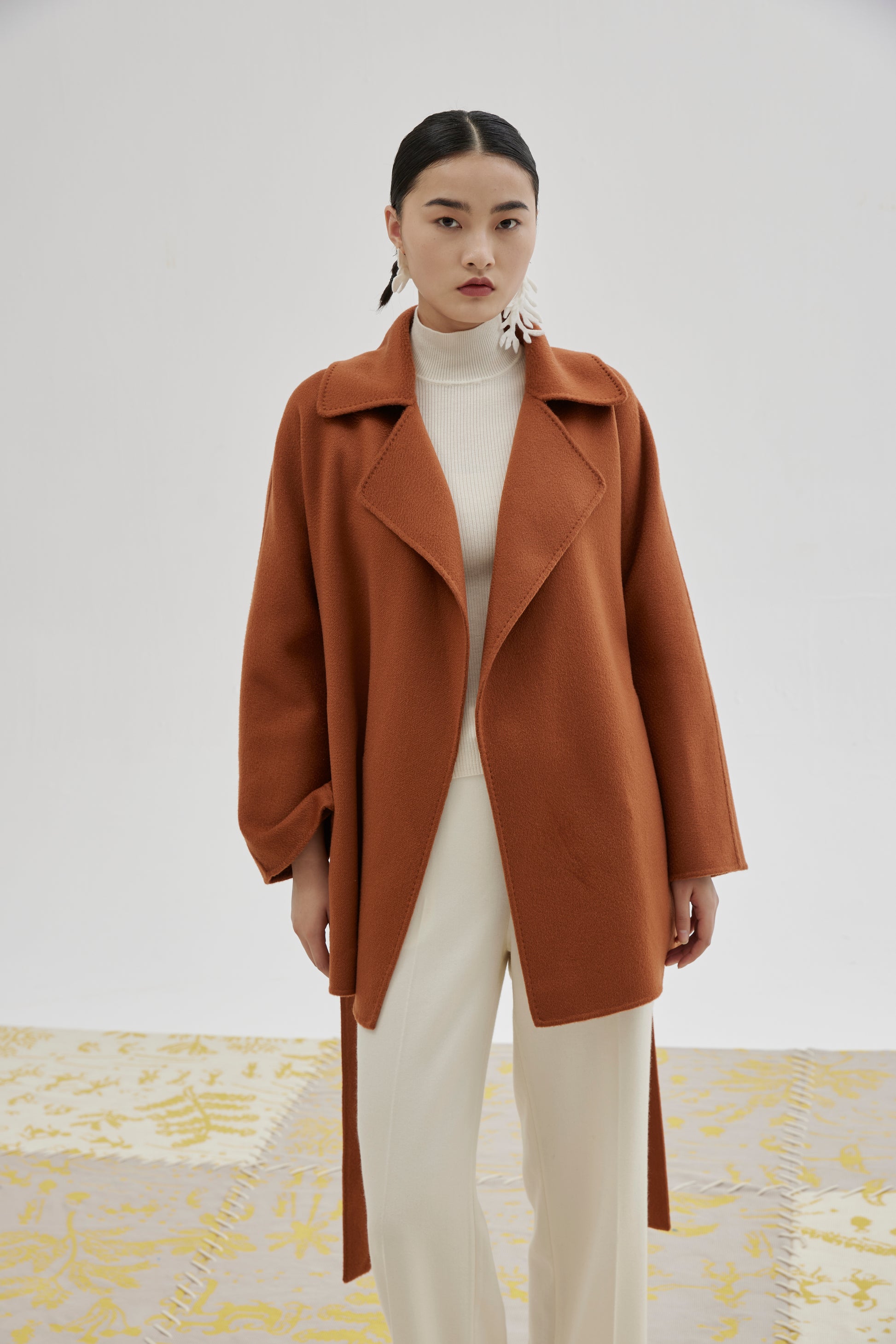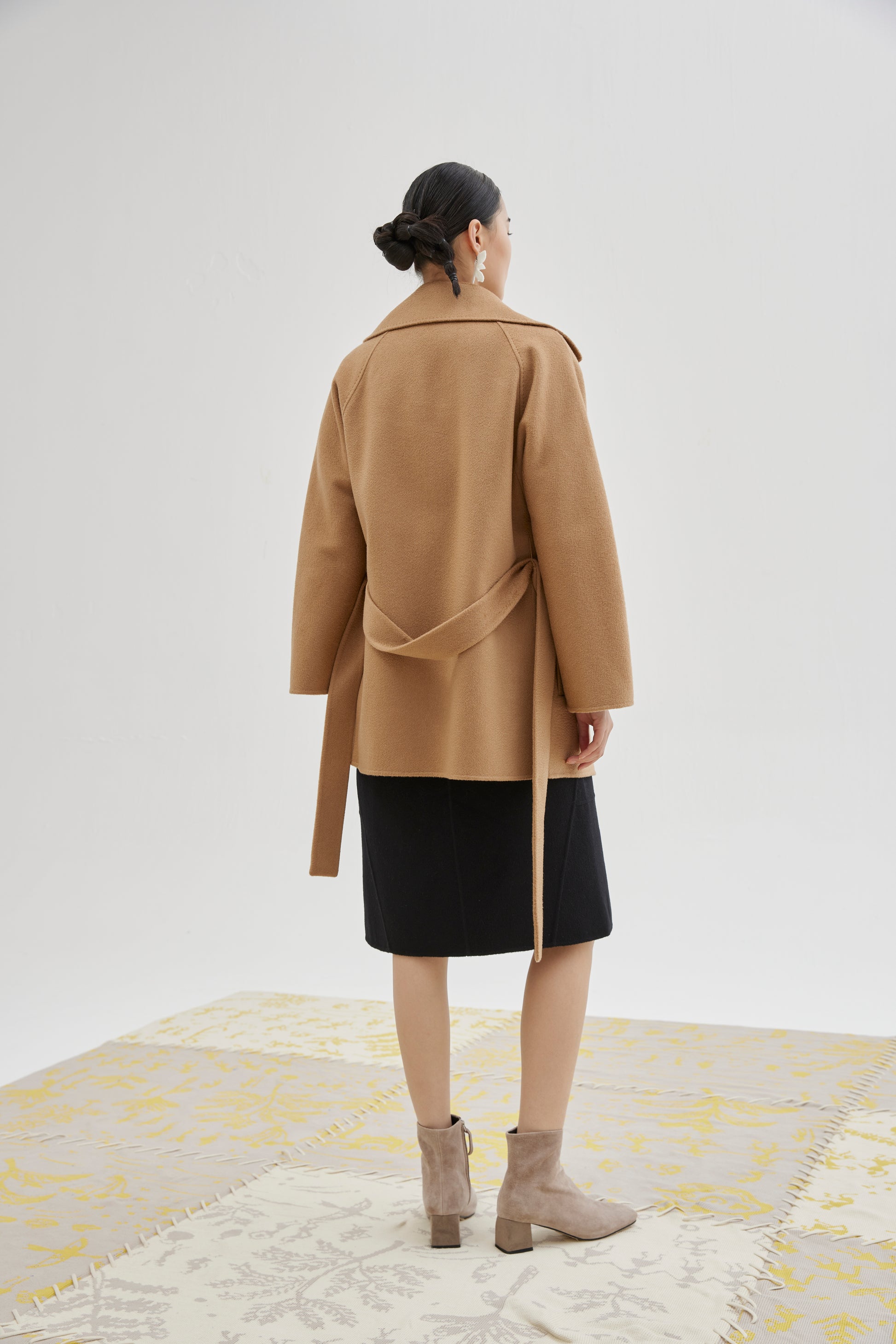 Double-faced sable cashmere, hand-sewn short cut featuring a lapel collar, welt pockets. Matching belt fastening.