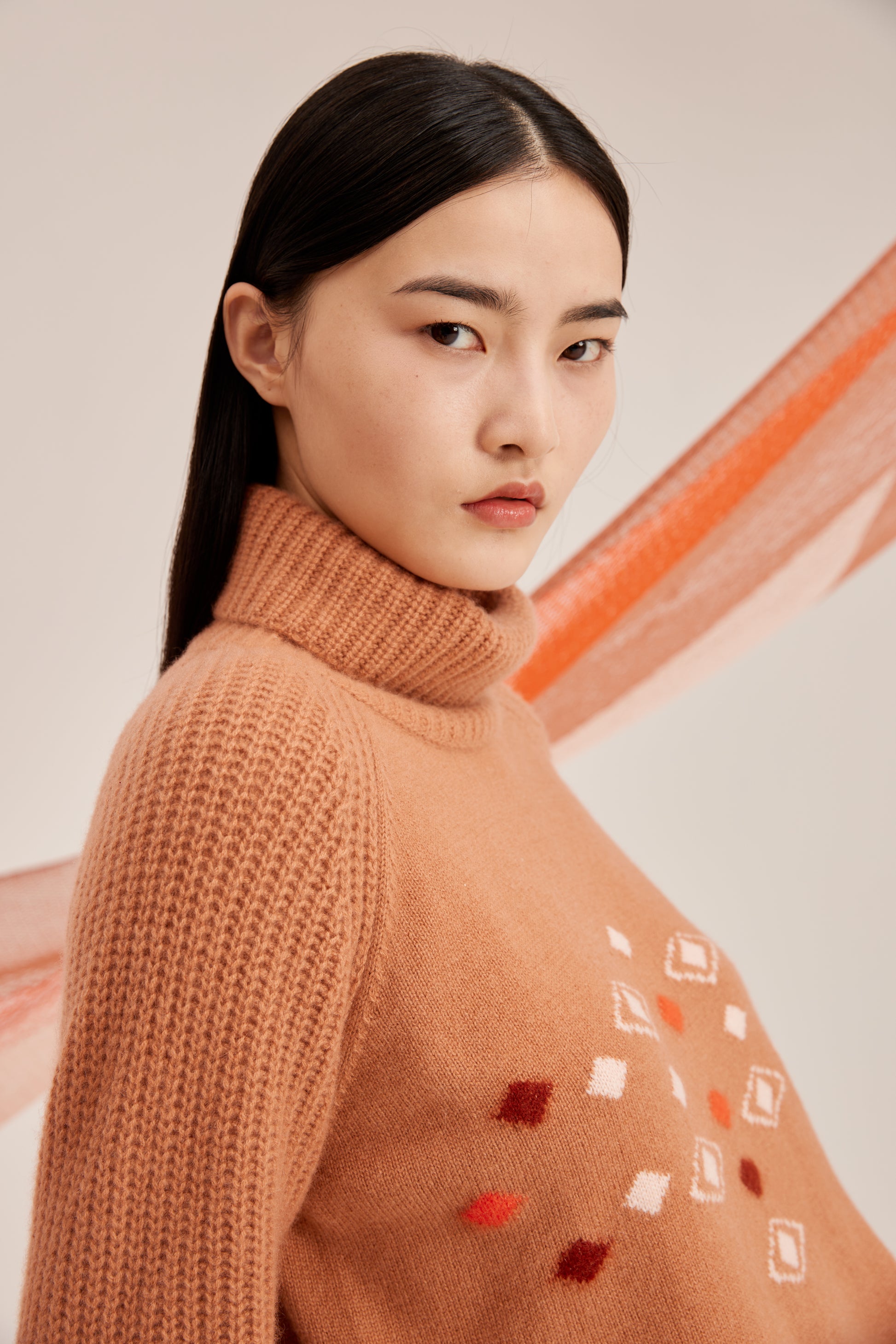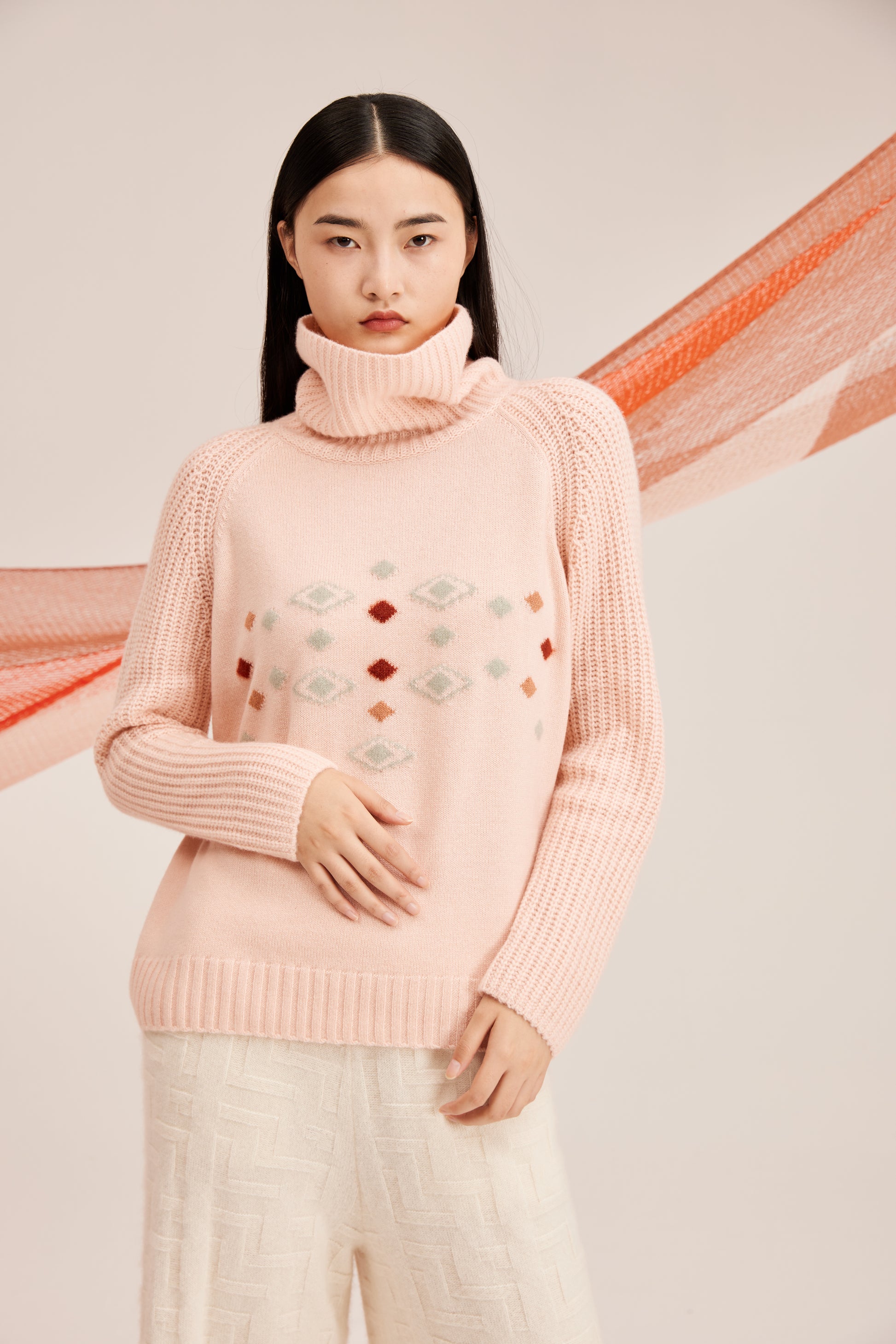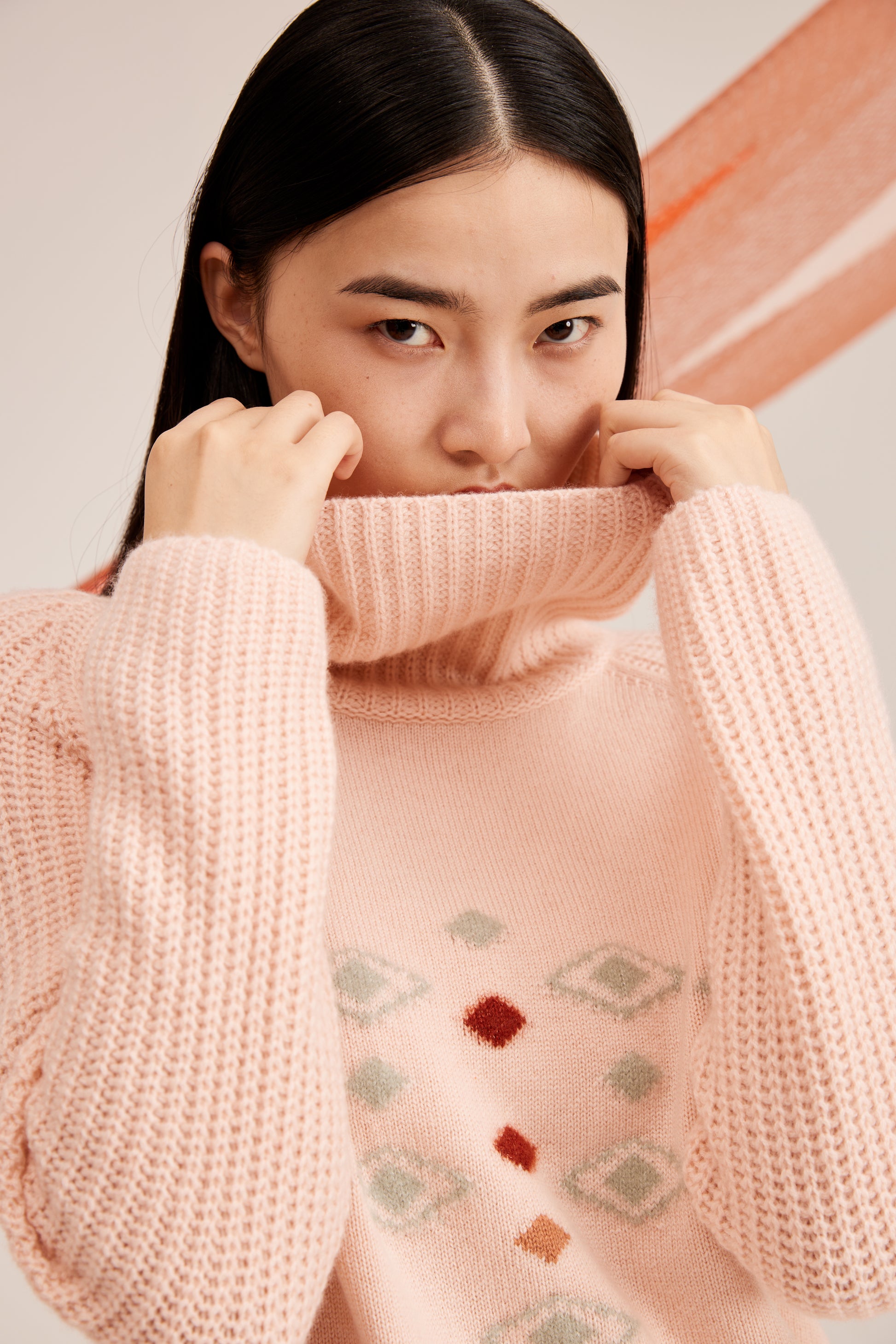 Pure cashmere bottle collar pullover, seleted 100% cashmere from Inner Mongolia, supler light and soft, the artic pattern on the chest to create sophisticated touch.