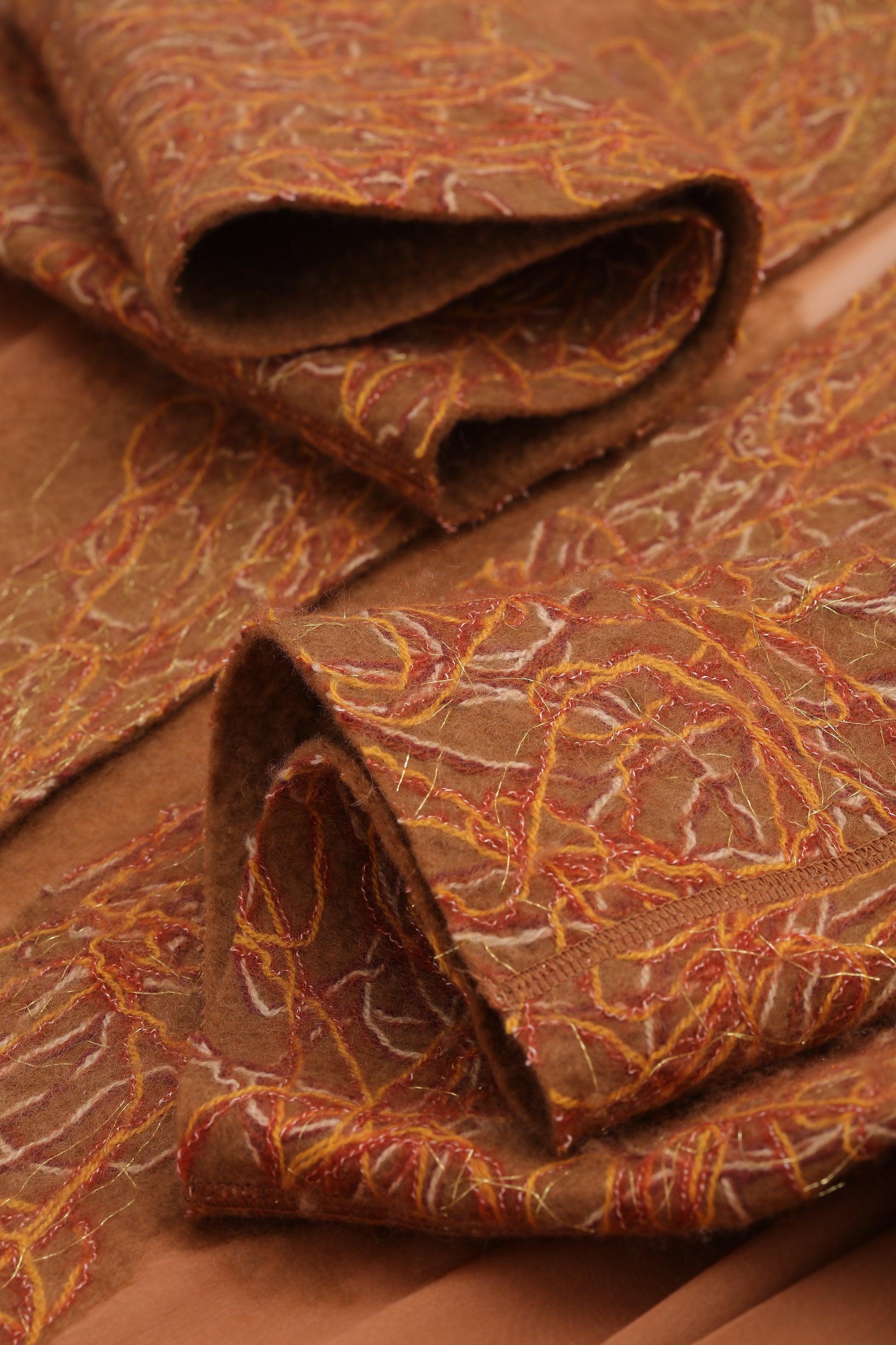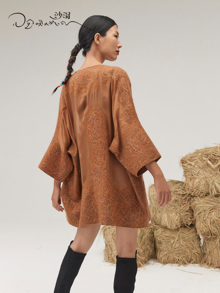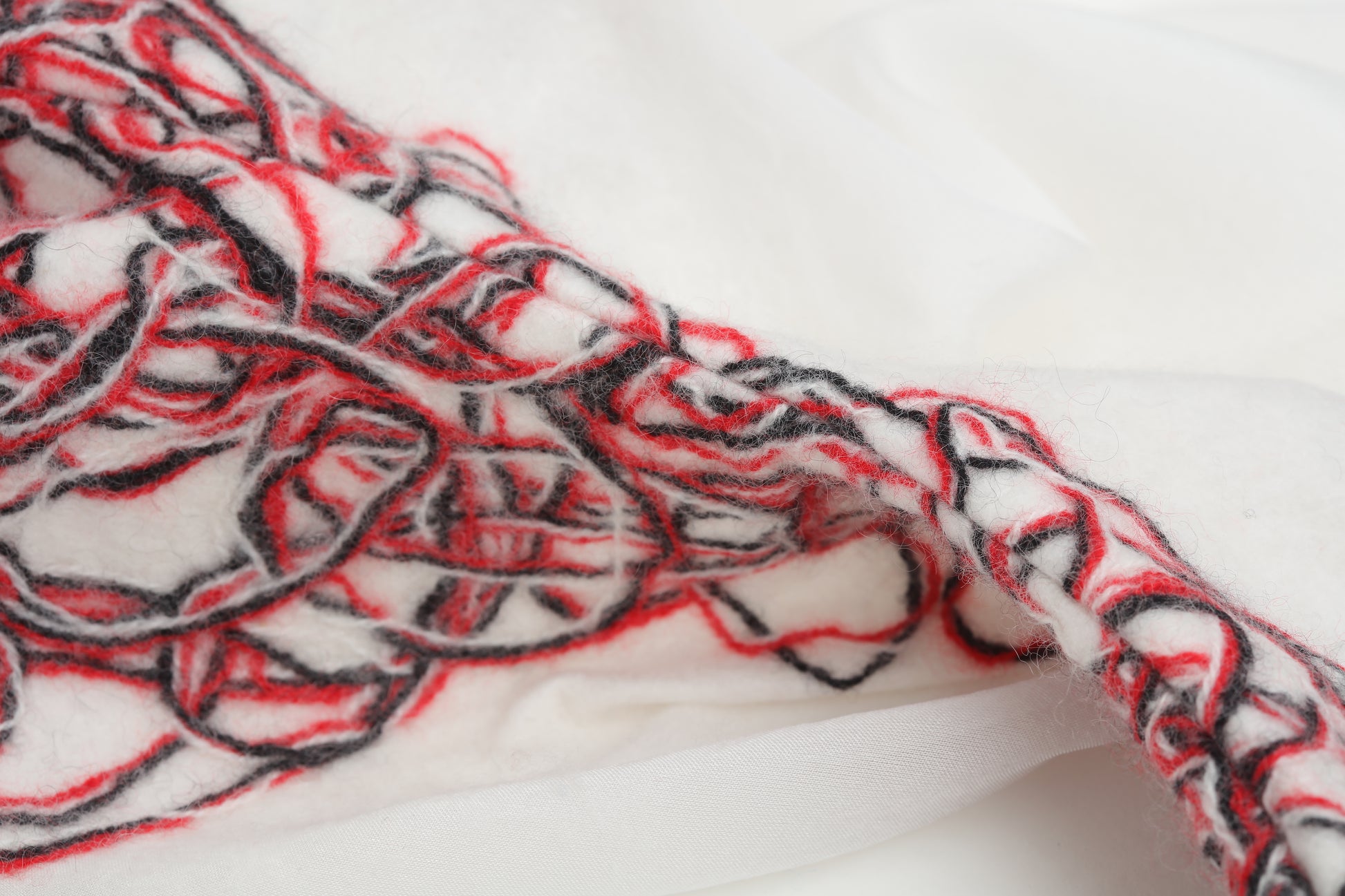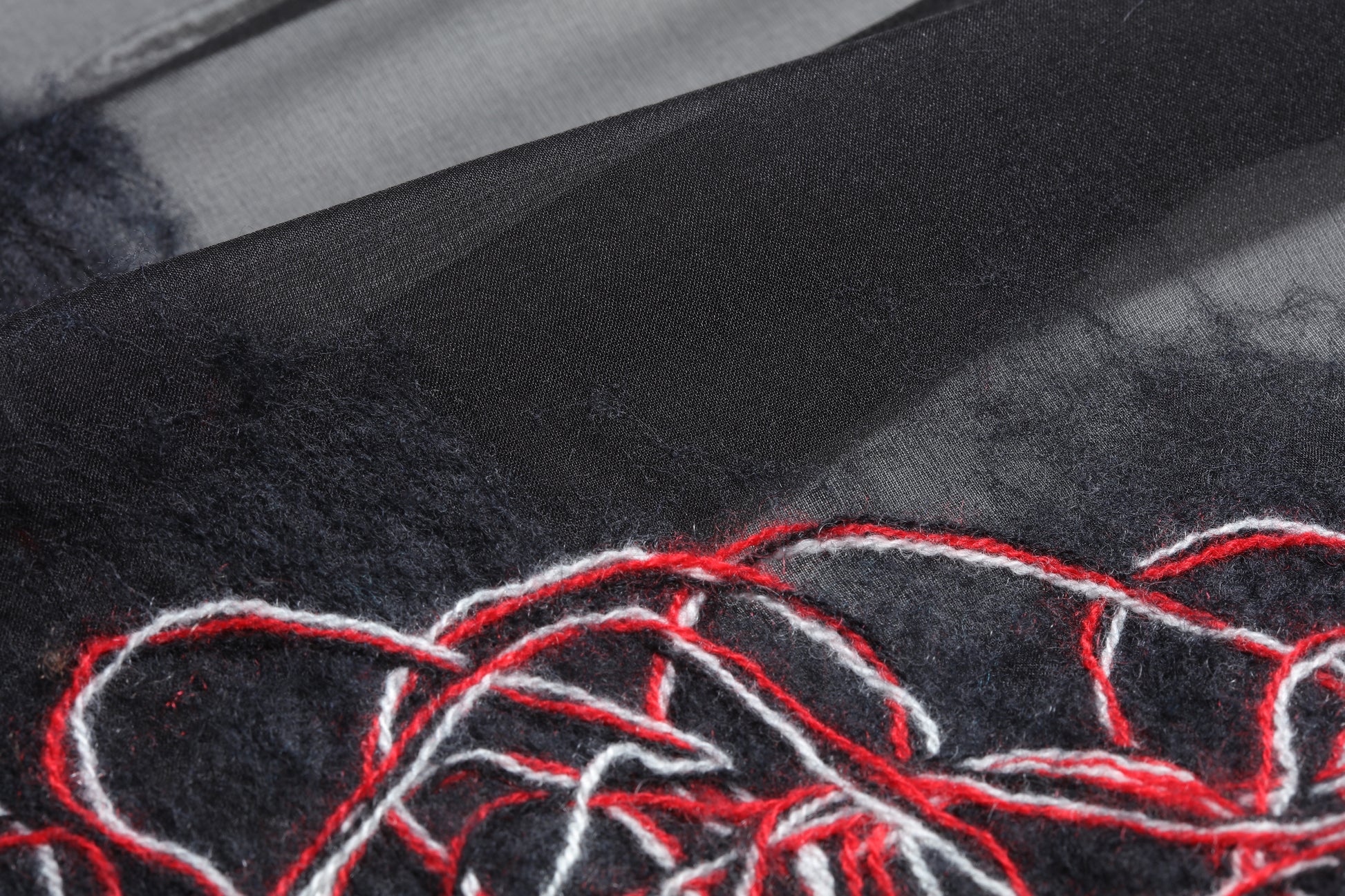 The silk as base mixed in the middle, cashmere is laid on the both sides. The fading colour makes a very artistic effect. The cashmere fibre and silk based combination create the uniqueness.